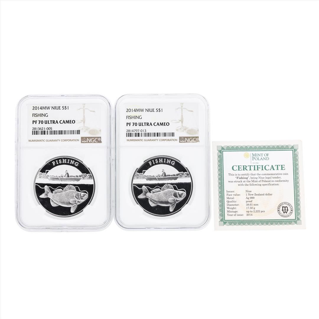 One Set of (2) 2014MW Niue $1 Fishing Silver Coins NGC PF70 Ultra Cameo.