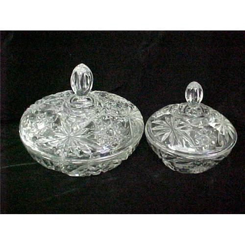 Set of 2 Anchor Hocking American Prescut Bowls with Lids. All 4 pieces in good shape! Diameters are about 7" and 5". Heights about 5" and 6". Great pieces that are always in use!