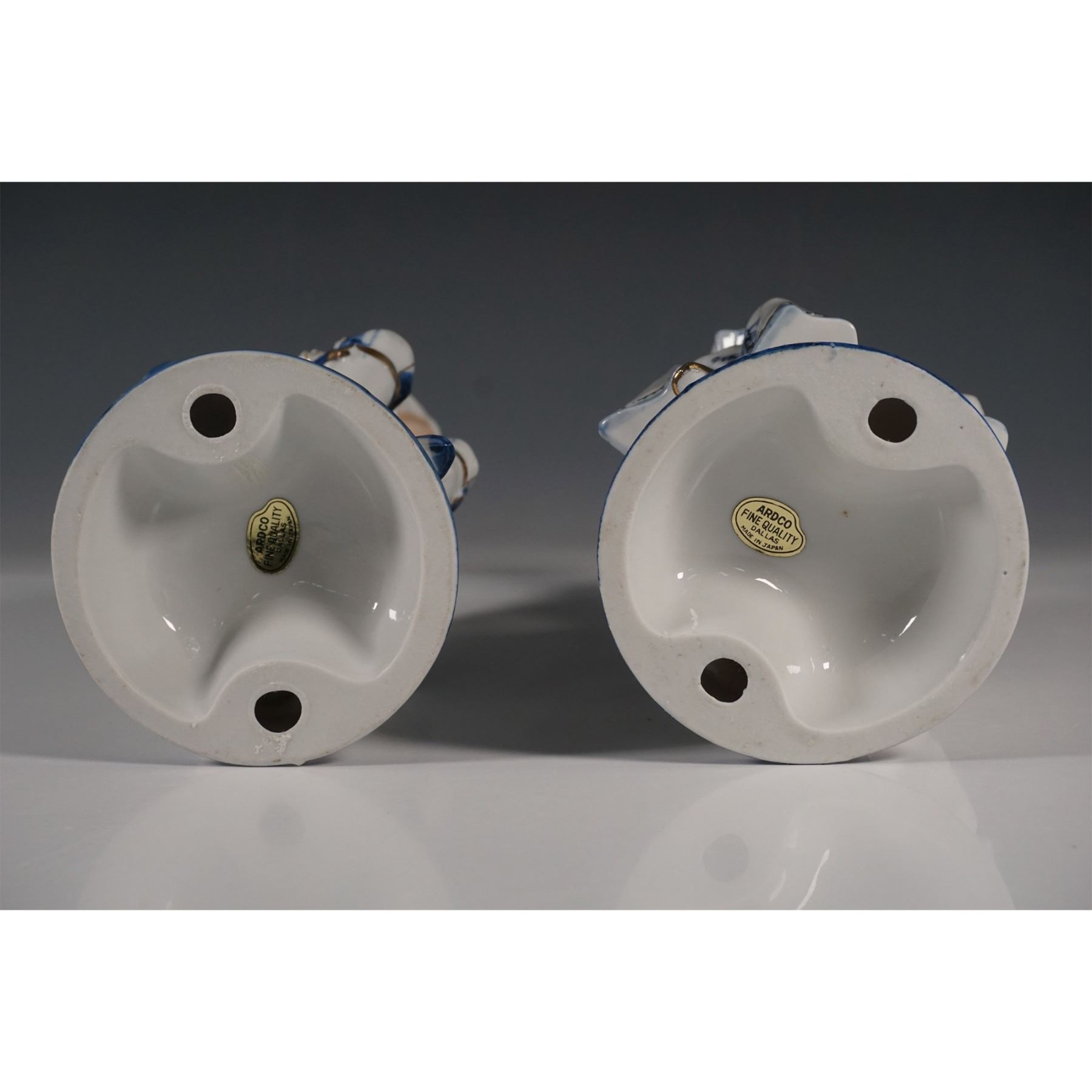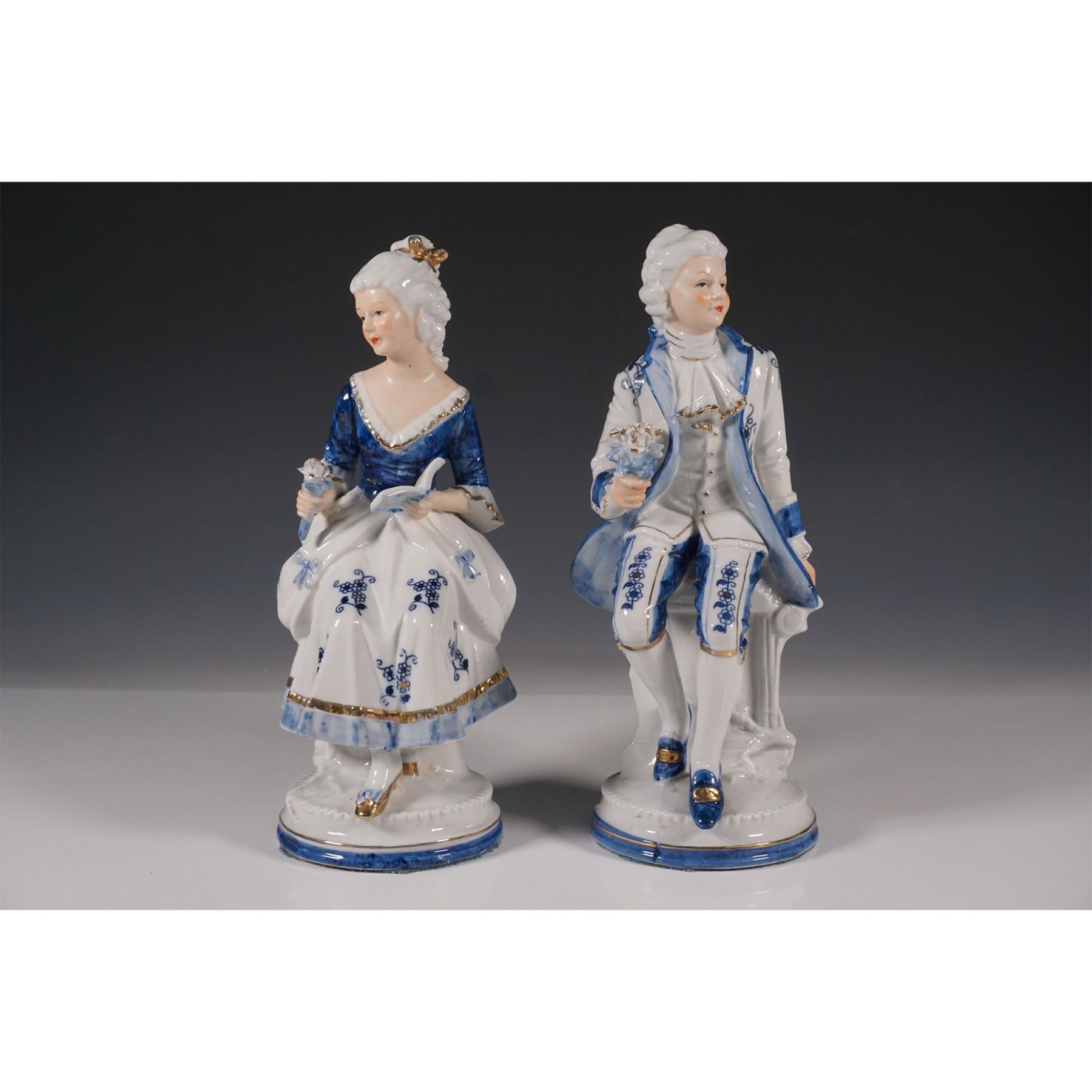 Set of two Ardco porcelain figurines featuring a finely dressed 18th-century couple in blue and white with gold accents. The female figure is seated with an open book and a flower, while the male figure is elegantly posed, holding a floral bouquet. These figurines showcase intricate detailing, including delicate facial features, ornate clothing patterns, and gilded highlights. Each piece bears the original Ardco Fine Quality Japan label on the base.