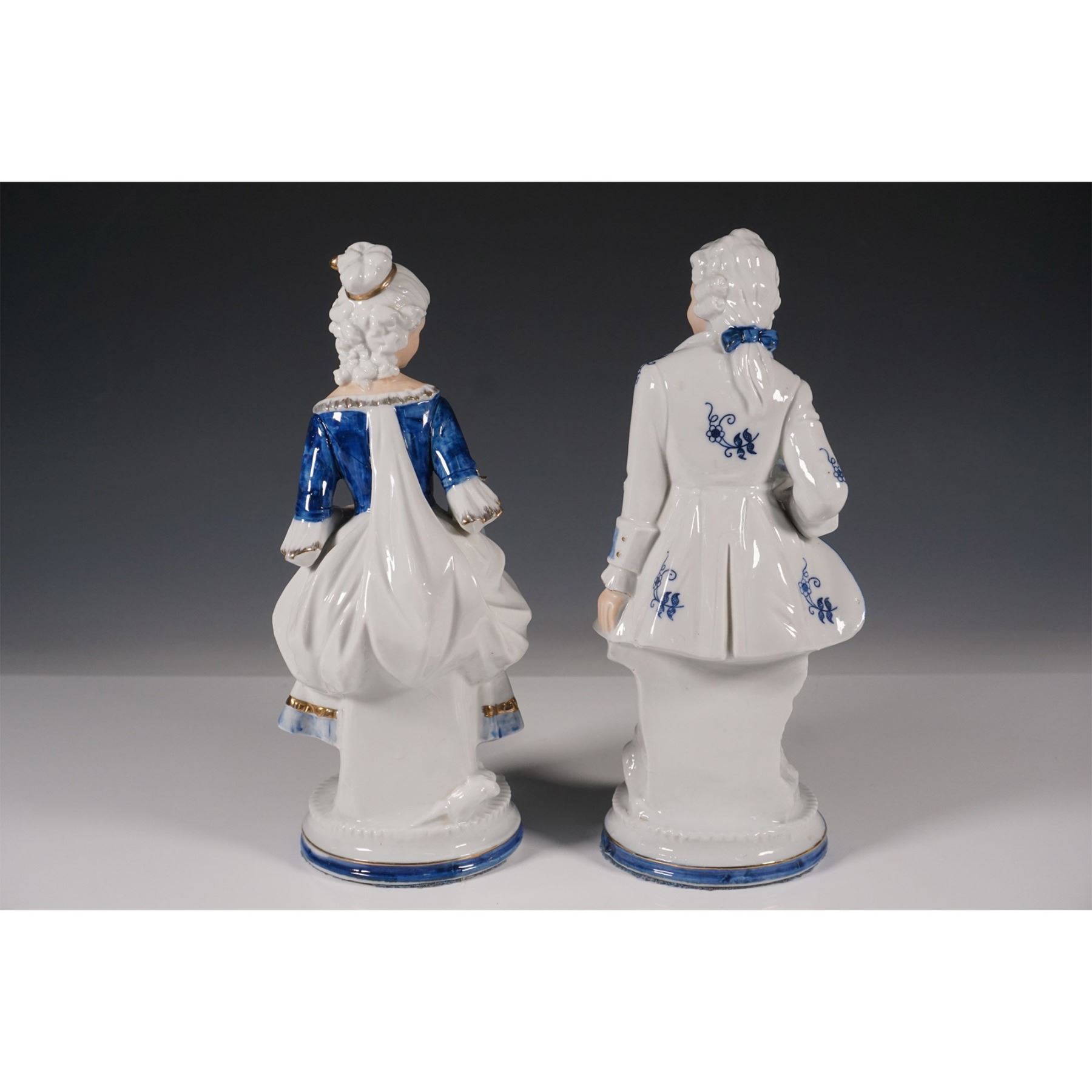 Set of two Ardco porcelain figurines featuring a finely dressed 18th-century couple in blue and white with gold accents. The female figure is seated with an open book and a flower, while the male figure is elegantly posed, holding a floral bouquet. These figurines showcase intricate detailing, including delicate facial features, ornate clothing patterns, and gilded highlights. Each piece bears the original Ardco Fine Quality Japan label on the base.
