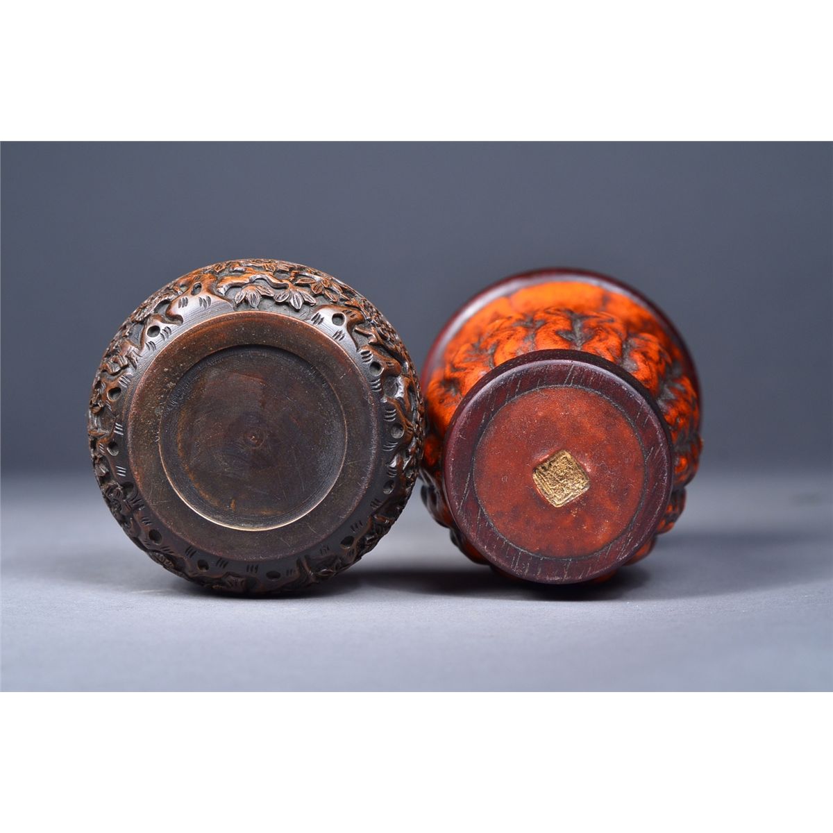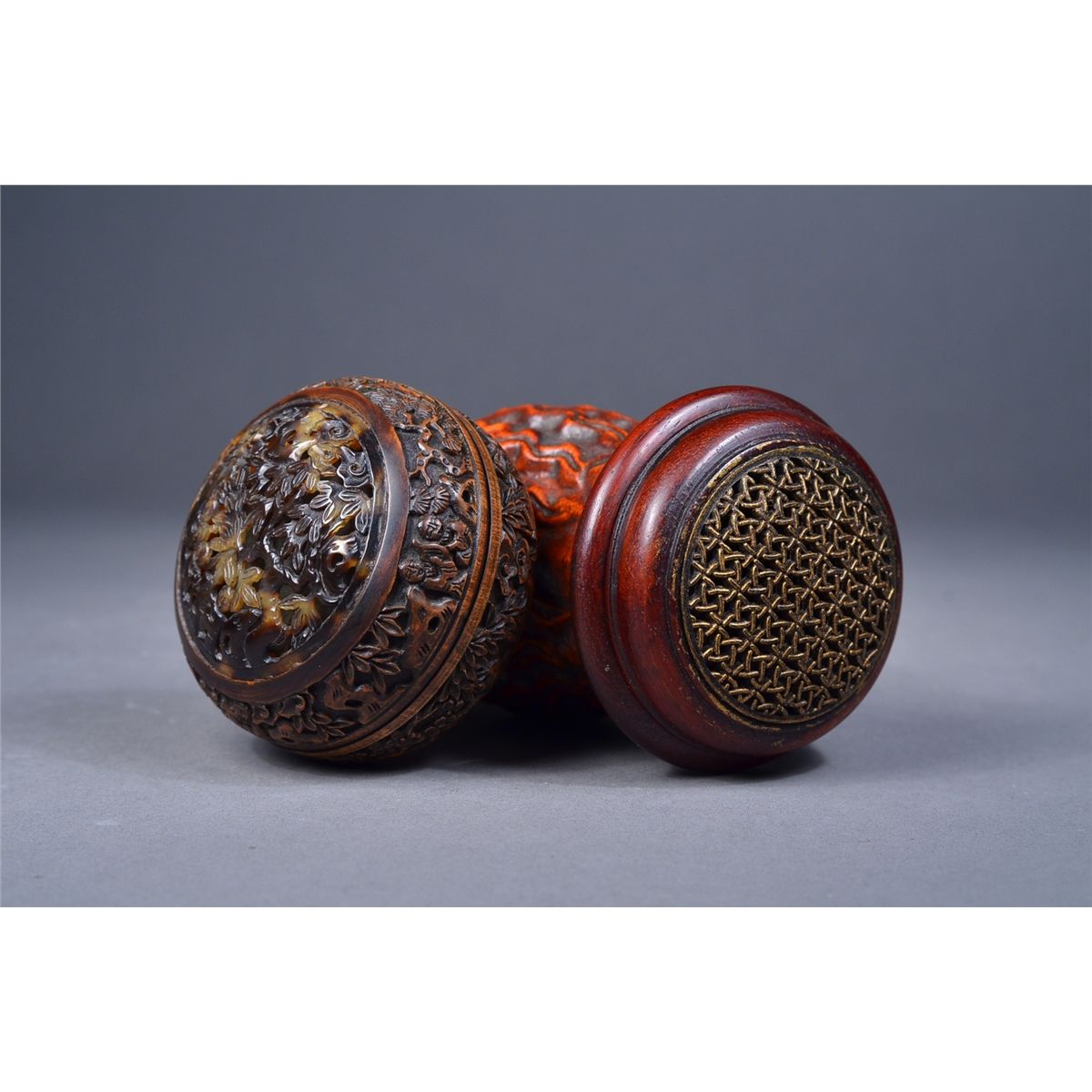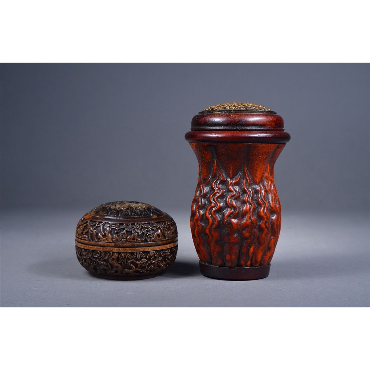 Set of two: Chinese carved bone box, featuring cover inset with openwork tortoise shell; cylindrical card wood cricket holder; H: 11 cm, D: 7 cm (cricket holder); H: 5 cm, D: 7 cm (box)