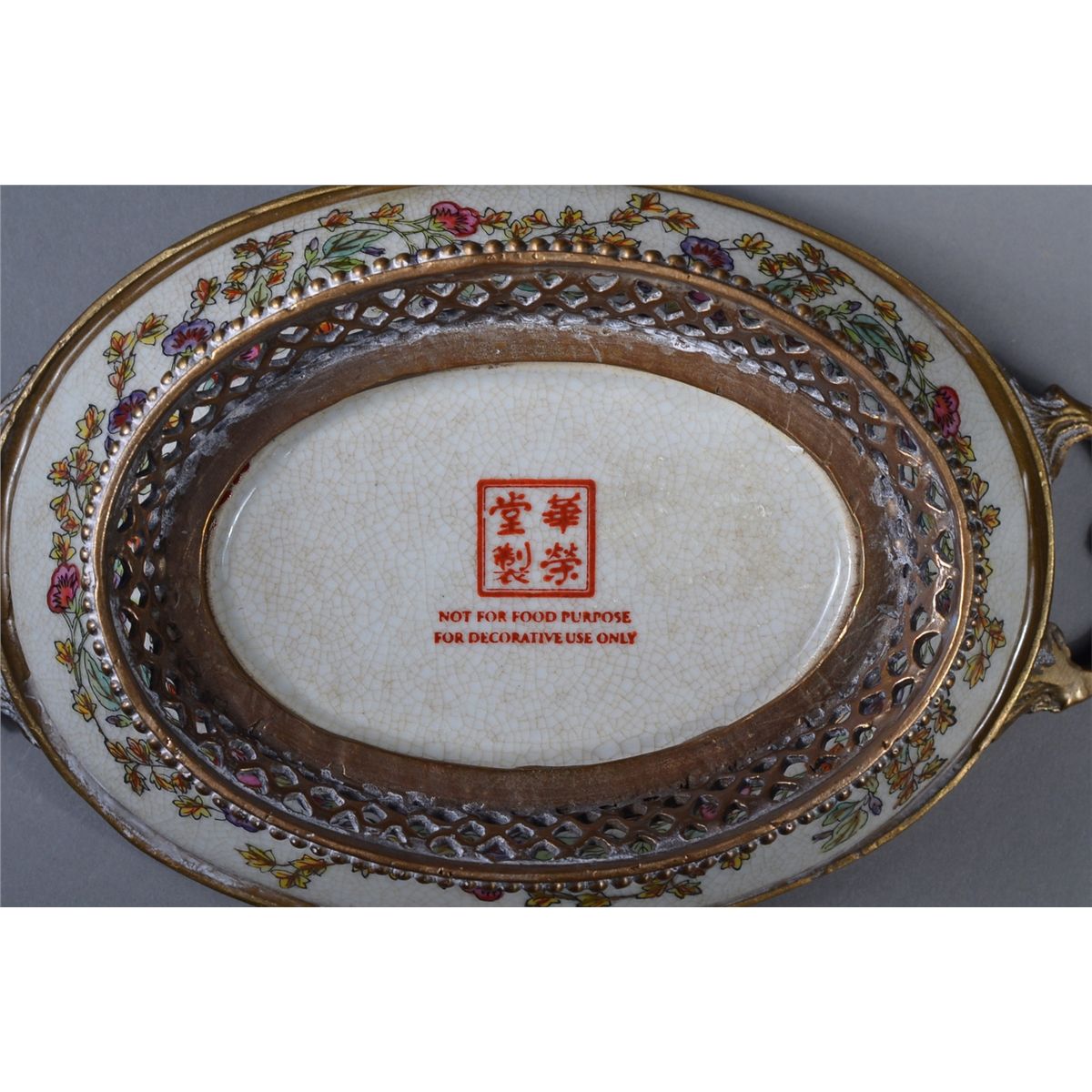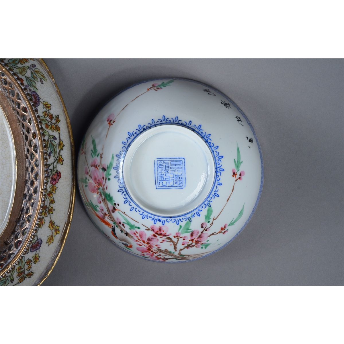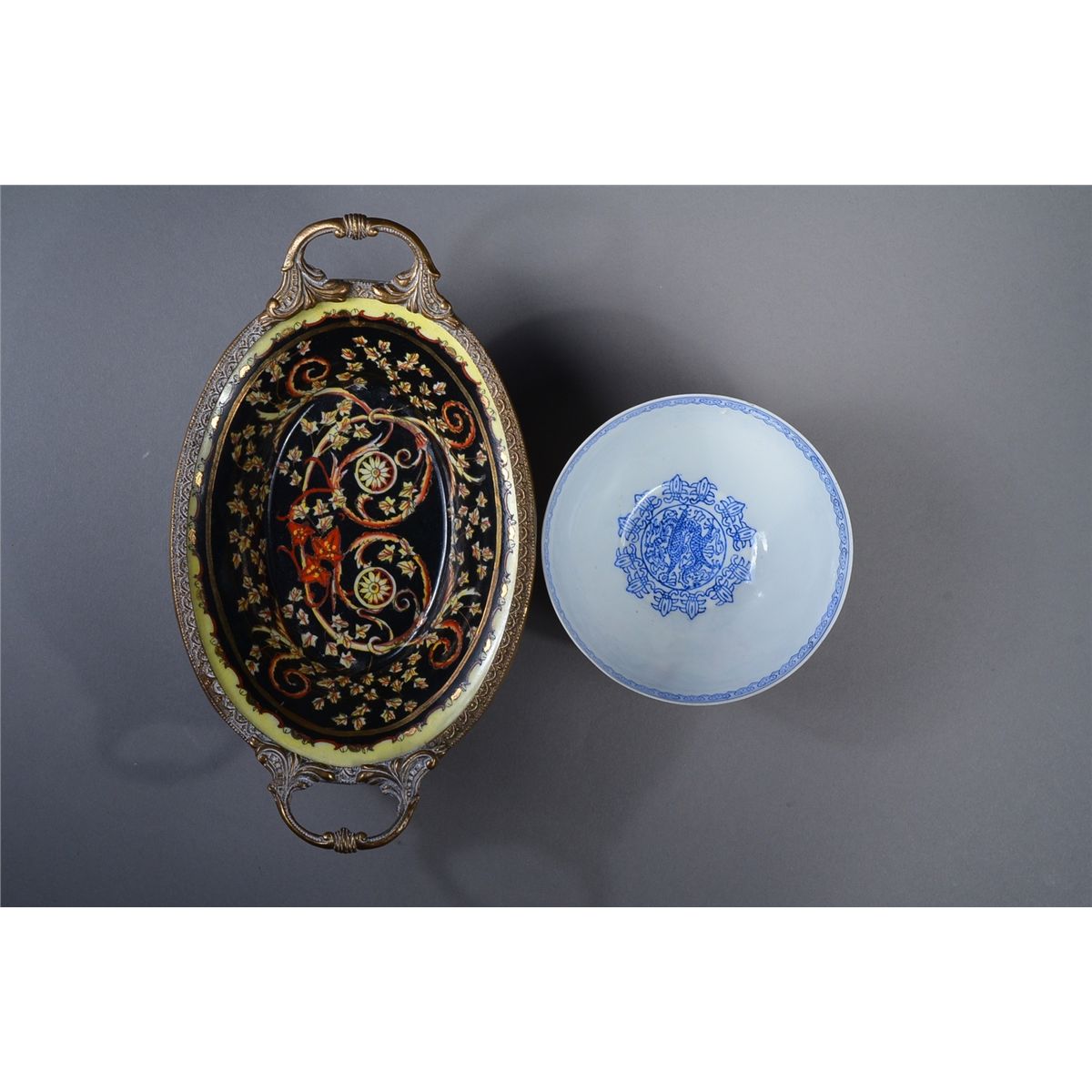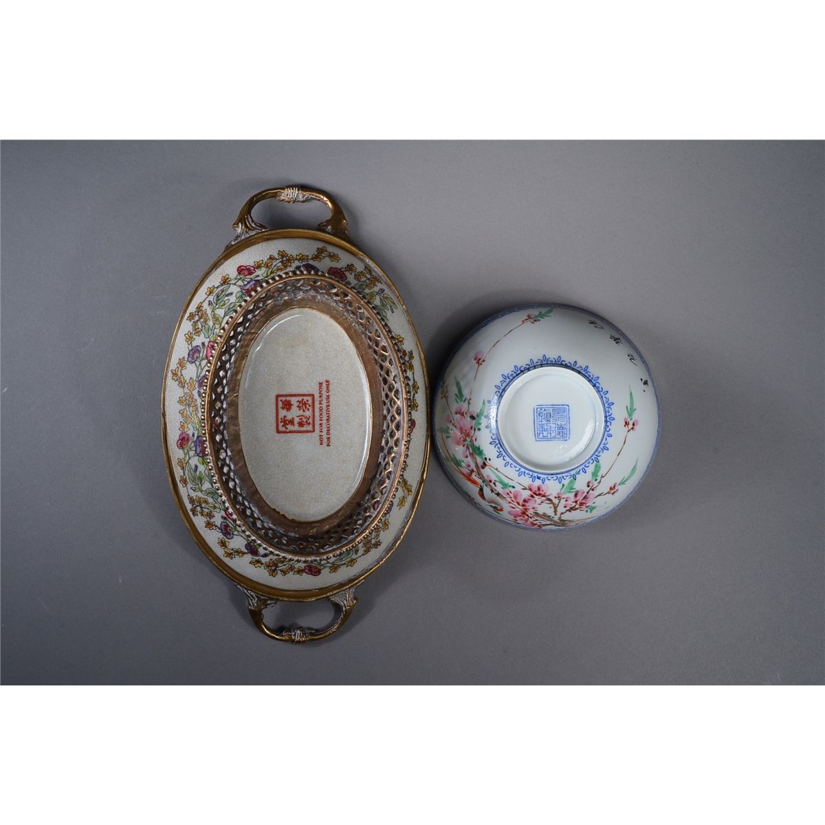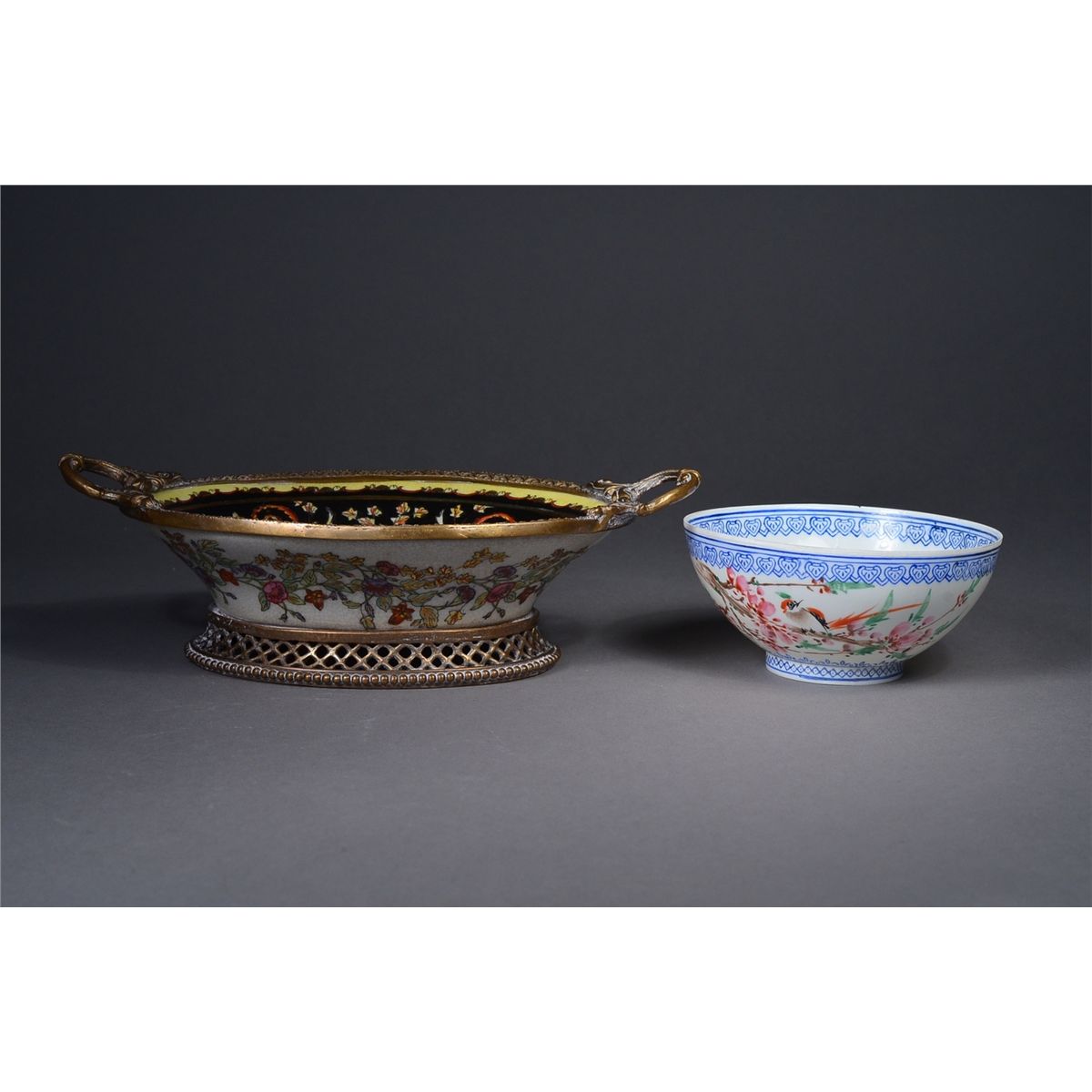 Set of two: Chinese egg shell porcelain dish and bronze export pot; marked on base; D: 10 cm (dish); H: 5 cm, L: 20 cm (bronze pot)