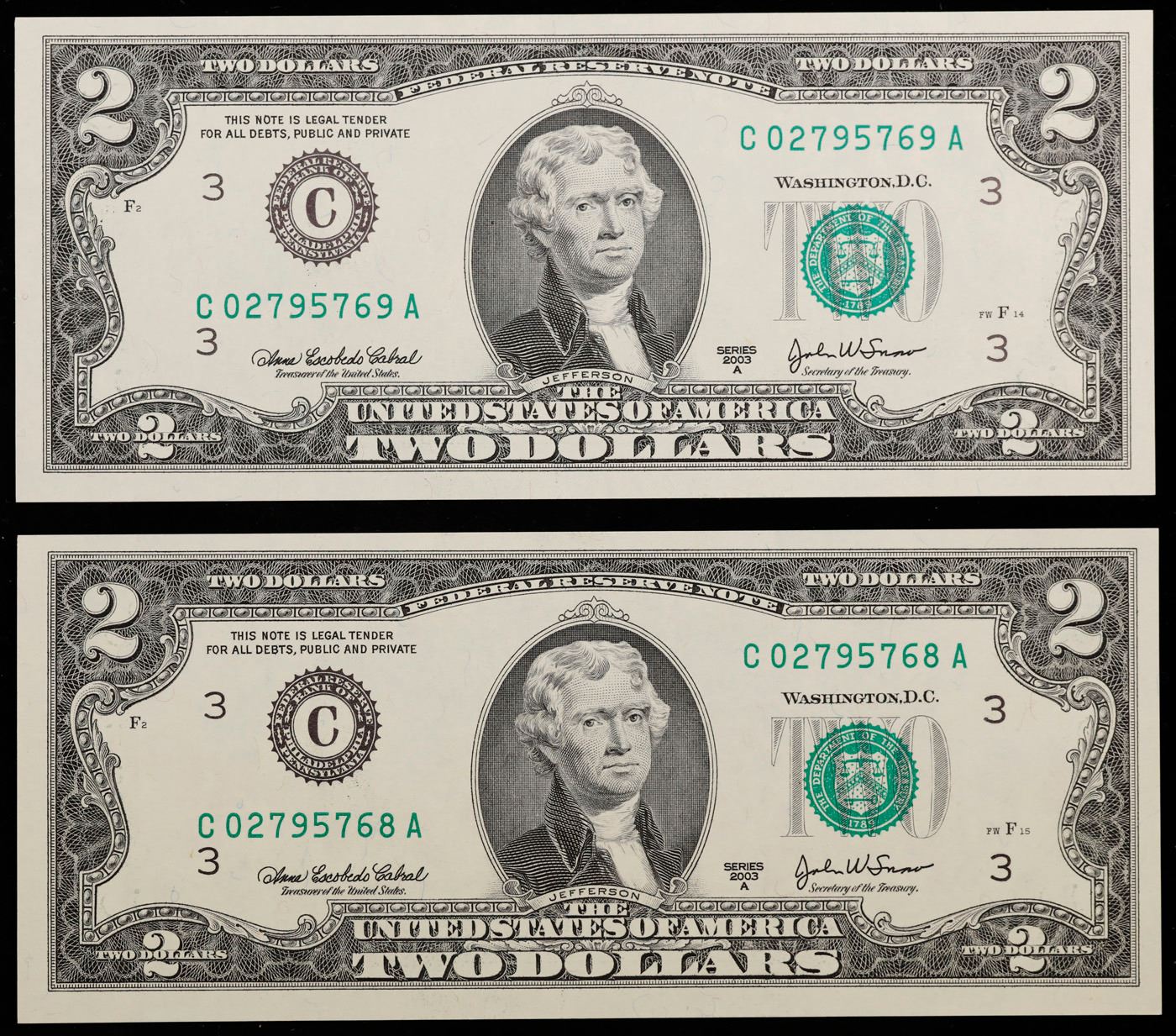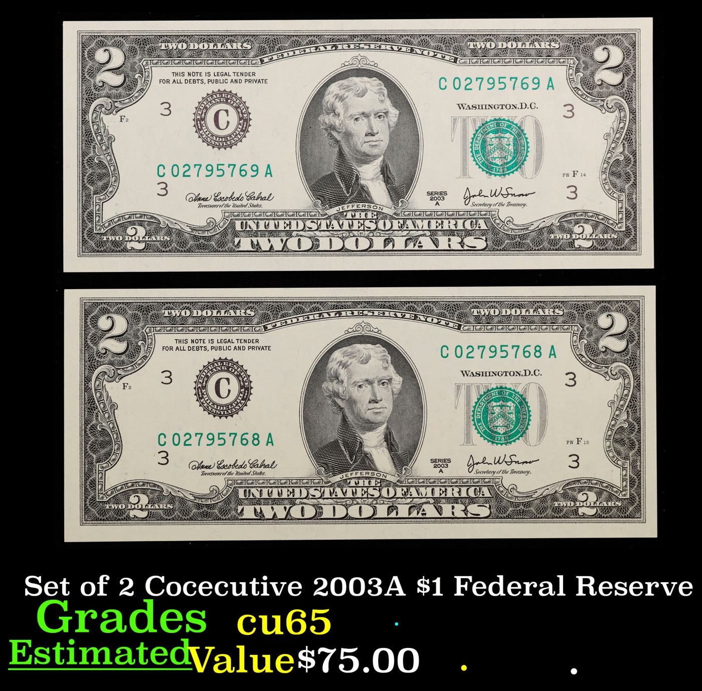 Set of 2 Cocecutive 2003A $1 Federal Reserve Note Grades Gem CU.