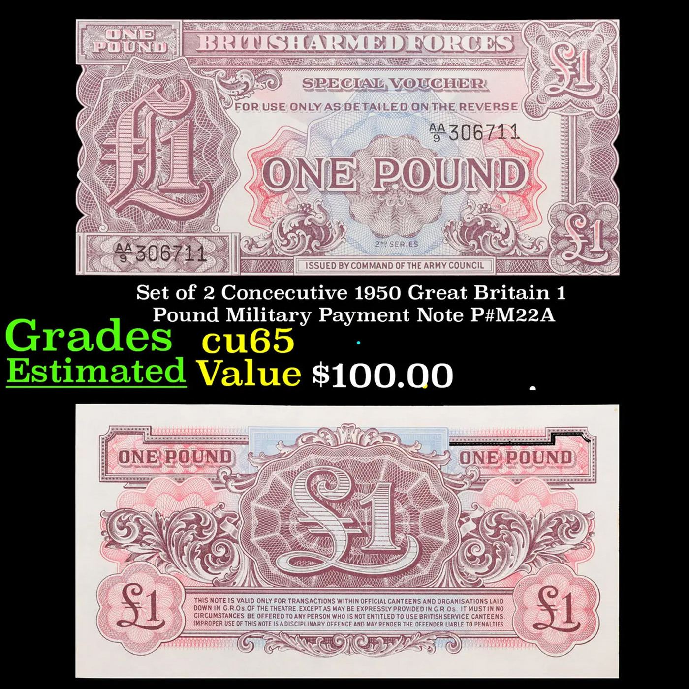 Set of 2 Concecutive 1950 Great Britain 1 Pound Military Payment Note P#M22A Grades Gem CU. These special voucher notes were given to british troop once deployed to colonial holdings or to posy ww2 occupied terratioes. Much the same as the u.s. Military payment notes the were from 1946 to 1973 and to help stabalize local economys by stopping an influx of Regular Pounds into said areas
