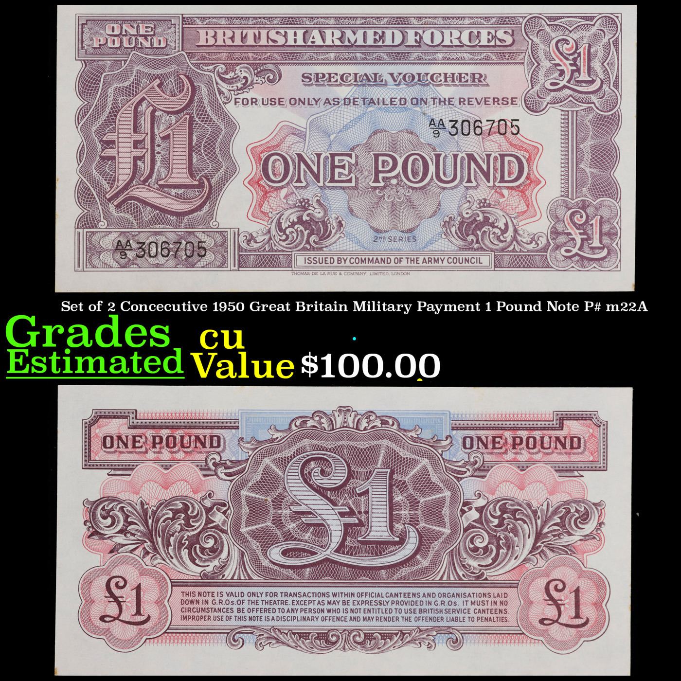 Set of 2 Concecutive 1950 Great Britain Military Payment 1 Pound Note P# m22A Grades CU