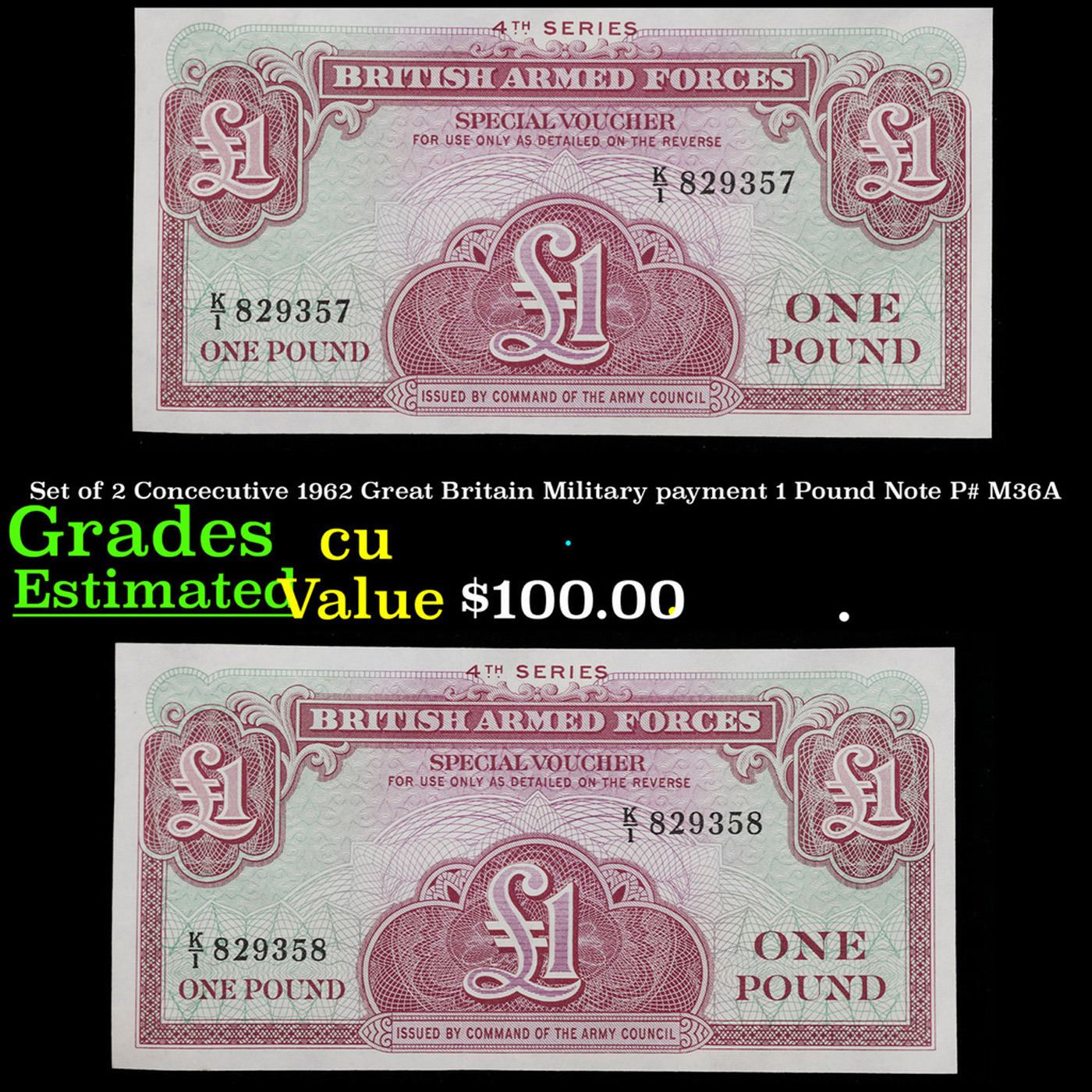 Set of 2 Concecutive 1962 Great Britain Military payment 1 Pound Note P# M36A Grades CU.