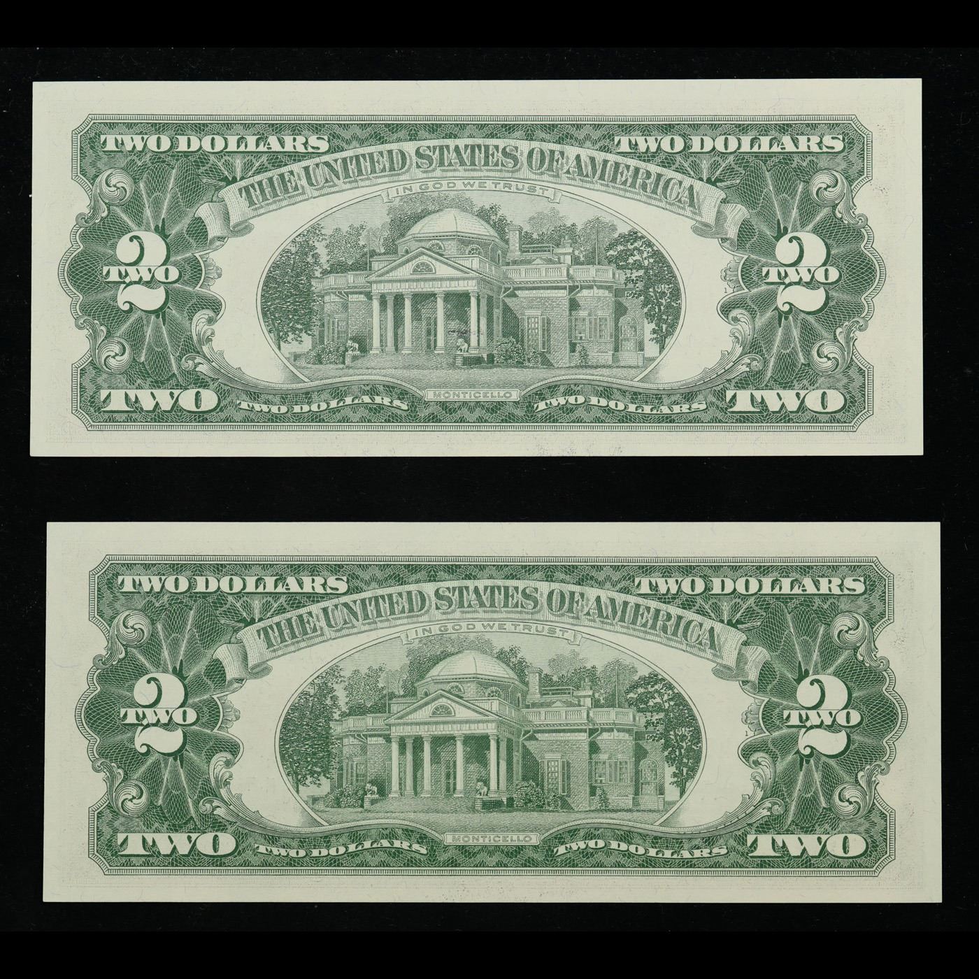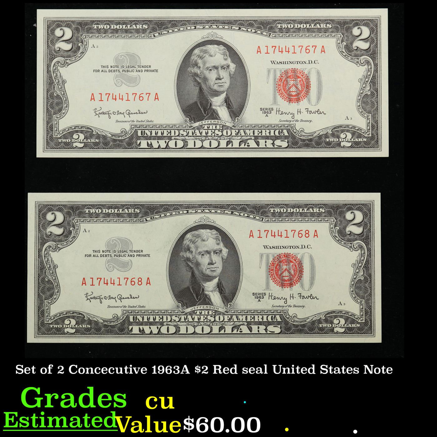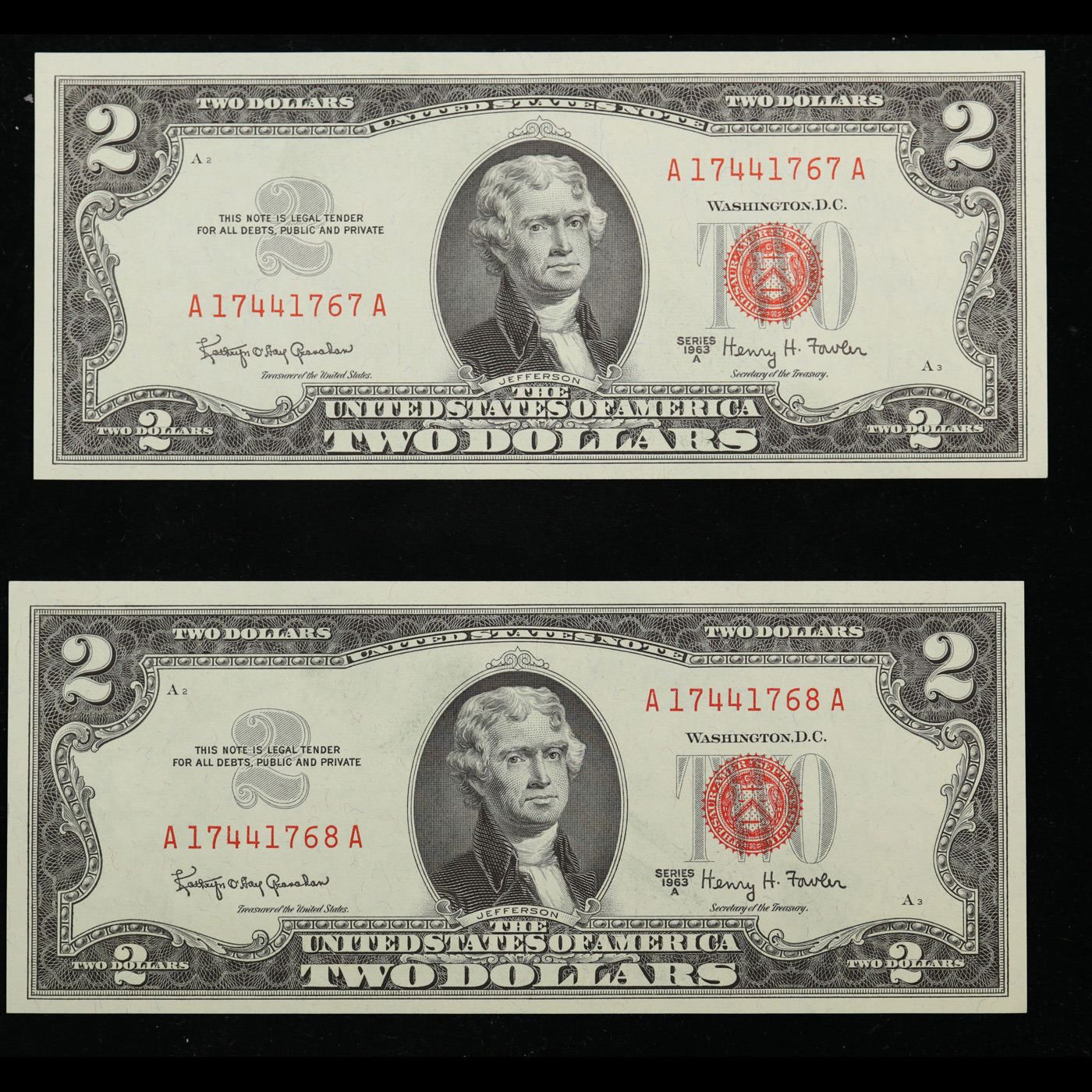 Set of 2 Concecutive 1963A $2 Red seal United States Note Grades CU. 1963 Legal Tender (United States Note). 1963 marks the last year that red seals were printed on two dollar bills. This is also the last year that Monticello was used on the back of two dollar bills. All two dollar bills from 1963 have a red seal on the right hand side of the bank note.