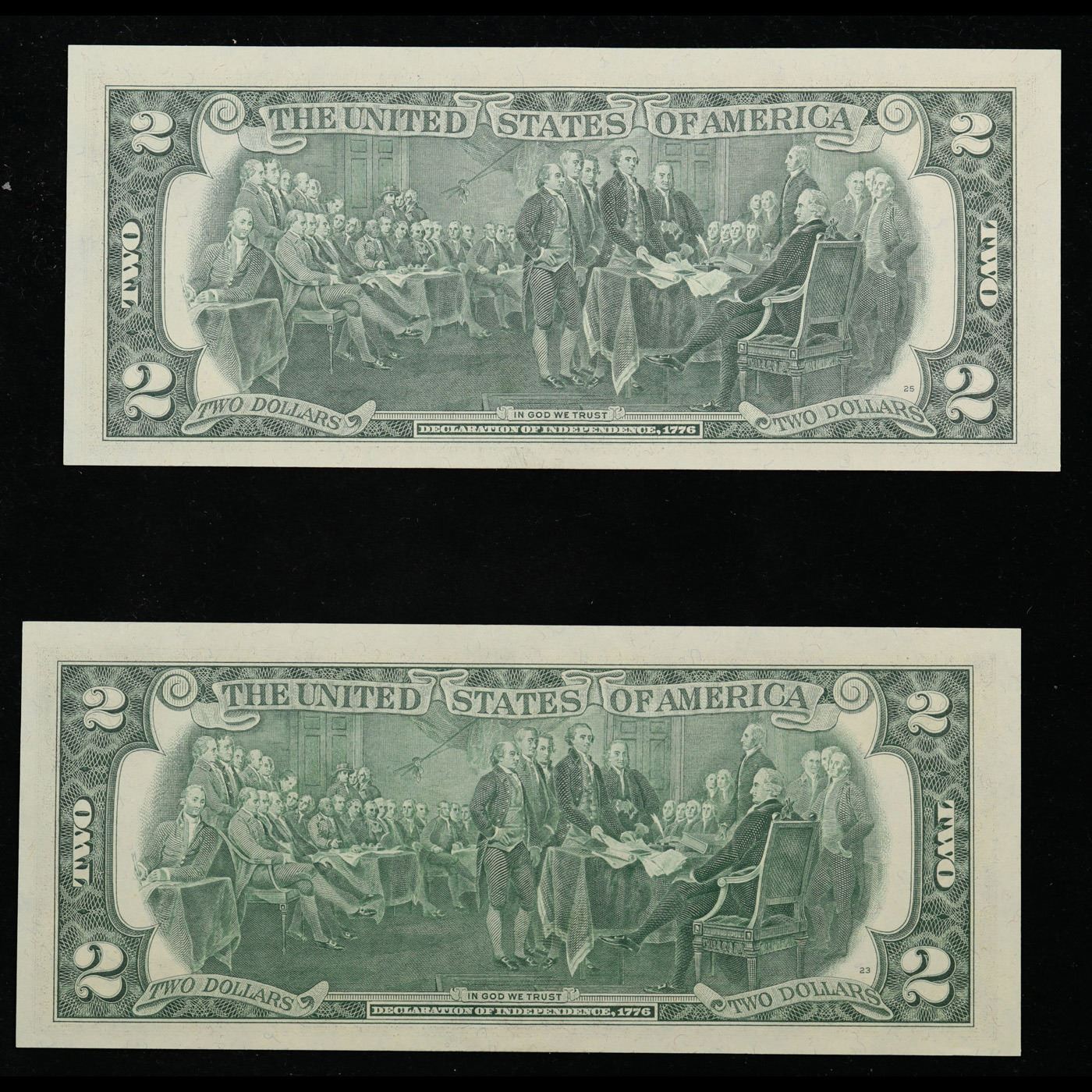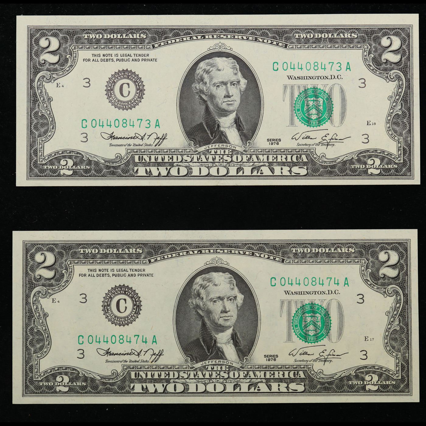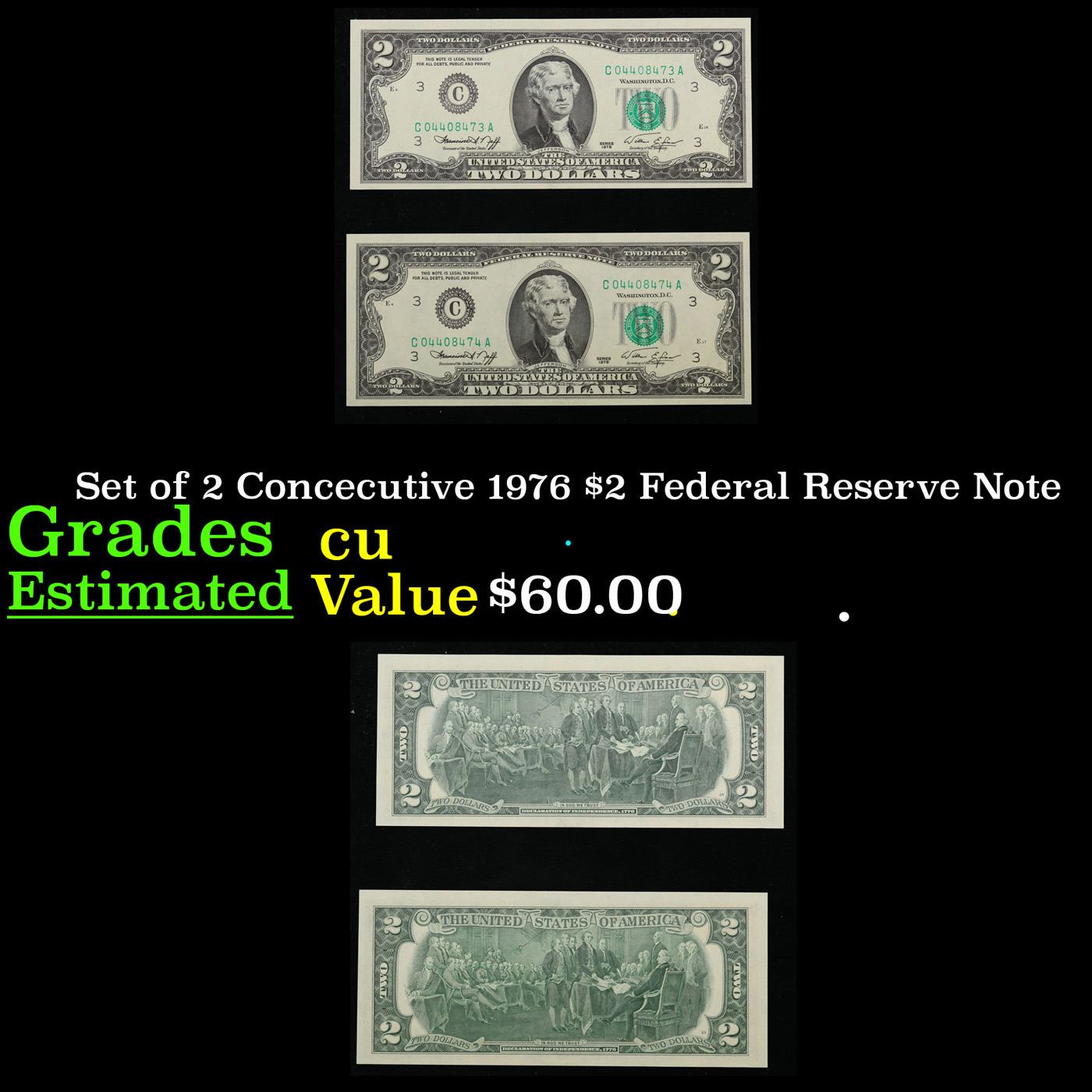 Set of 2 Concecutive 1976 $2 Federal Reserve Note Grades CU.