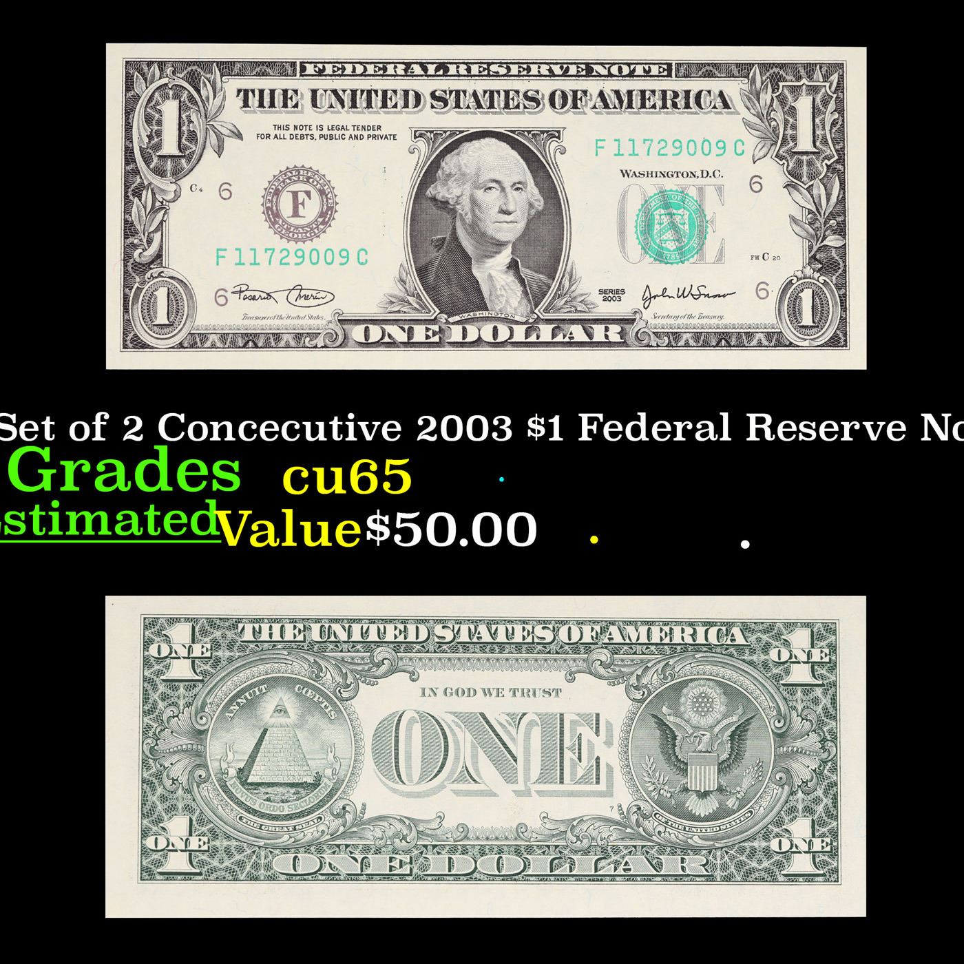 Set of 2 Concecutive 2003 $1 Federal Reserve Note Grades Gem CU.
