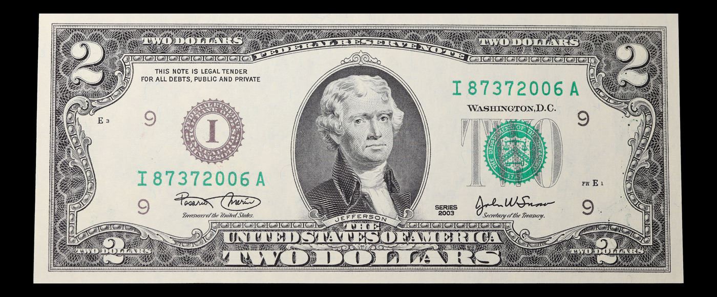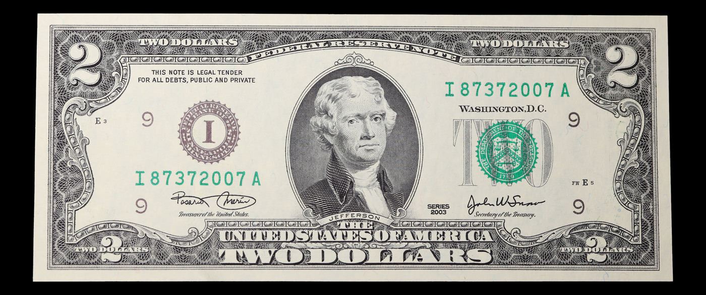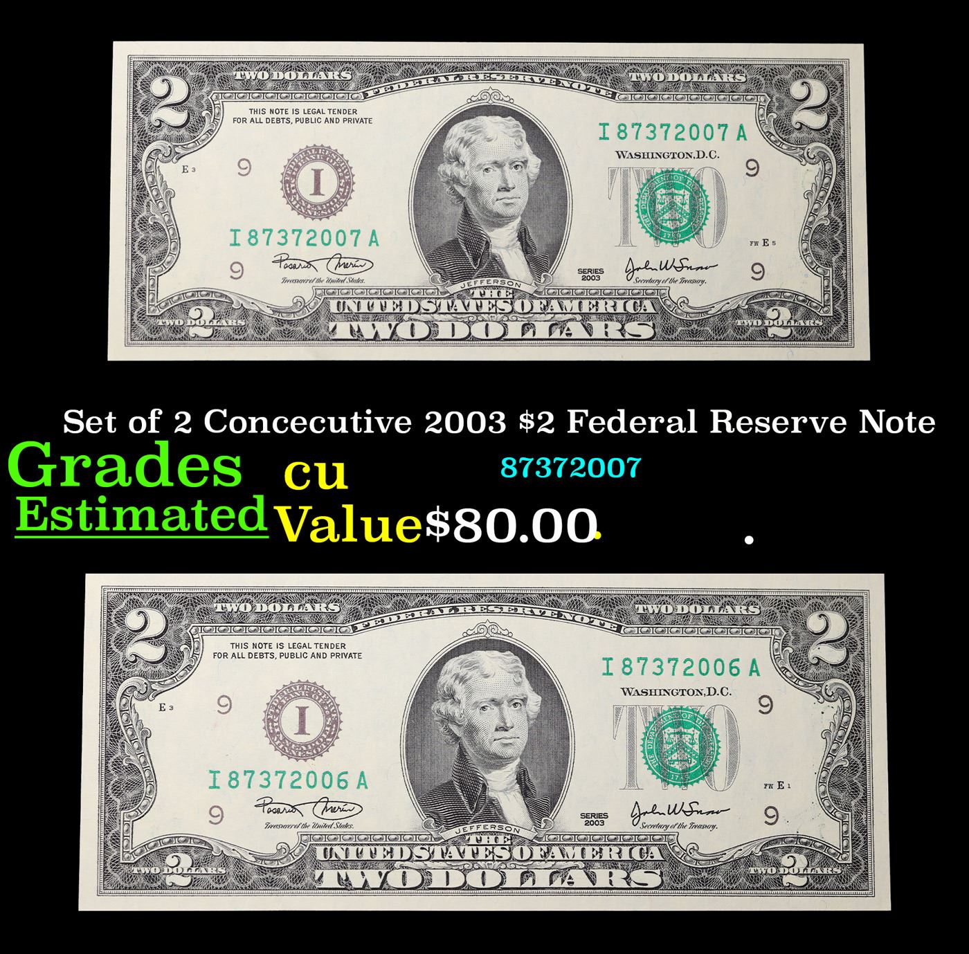 Set of 2 Concecutive 2003 $2 Federal Reserve Note Grades CU.
