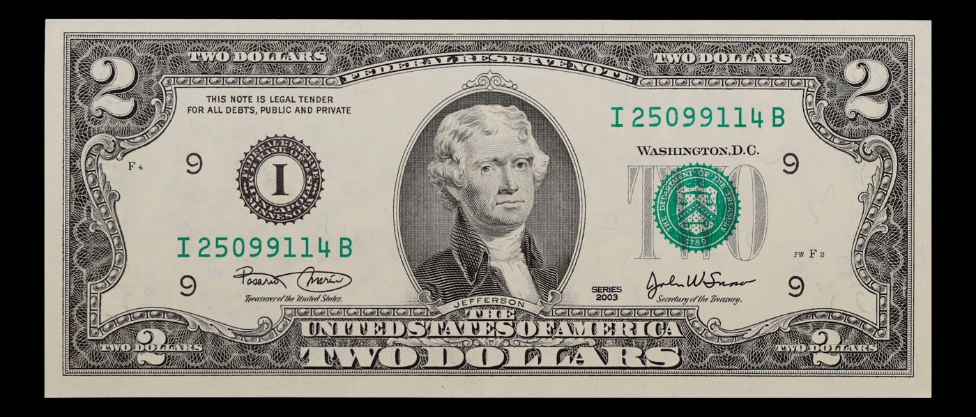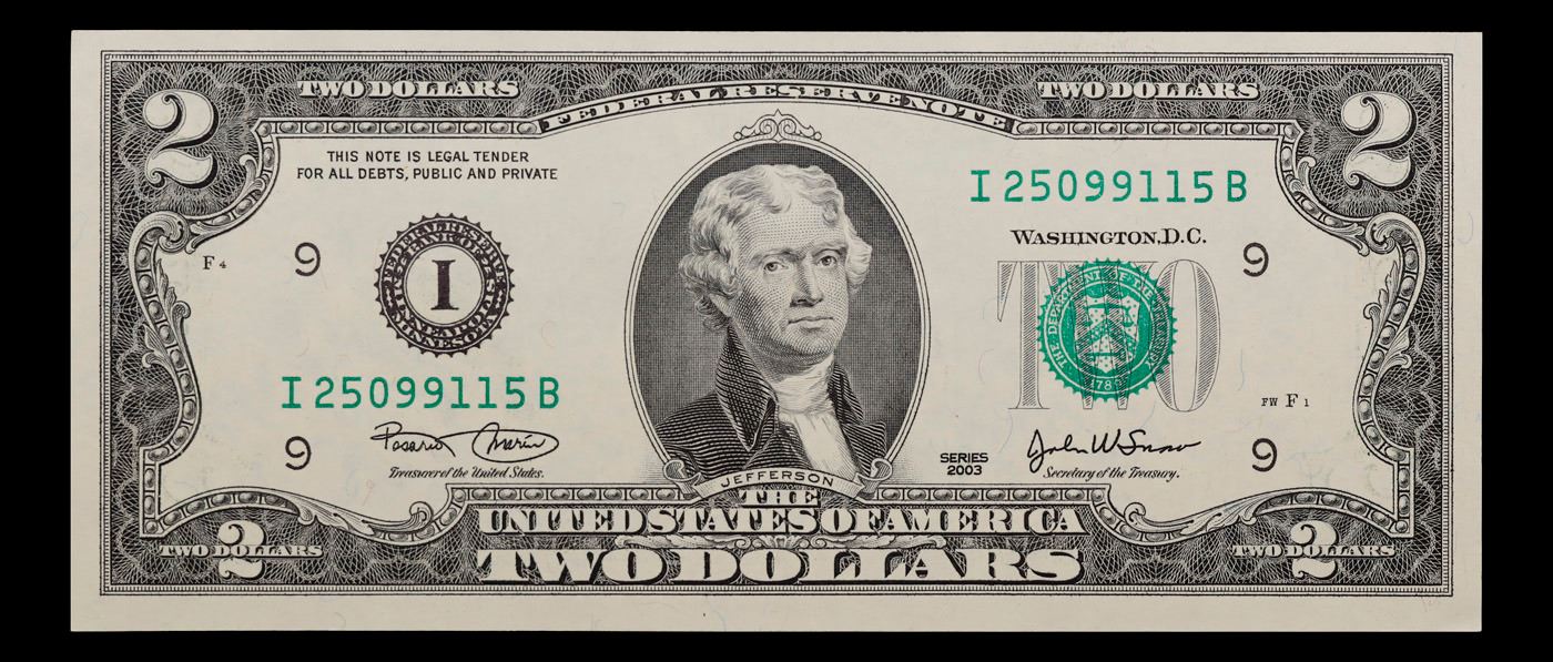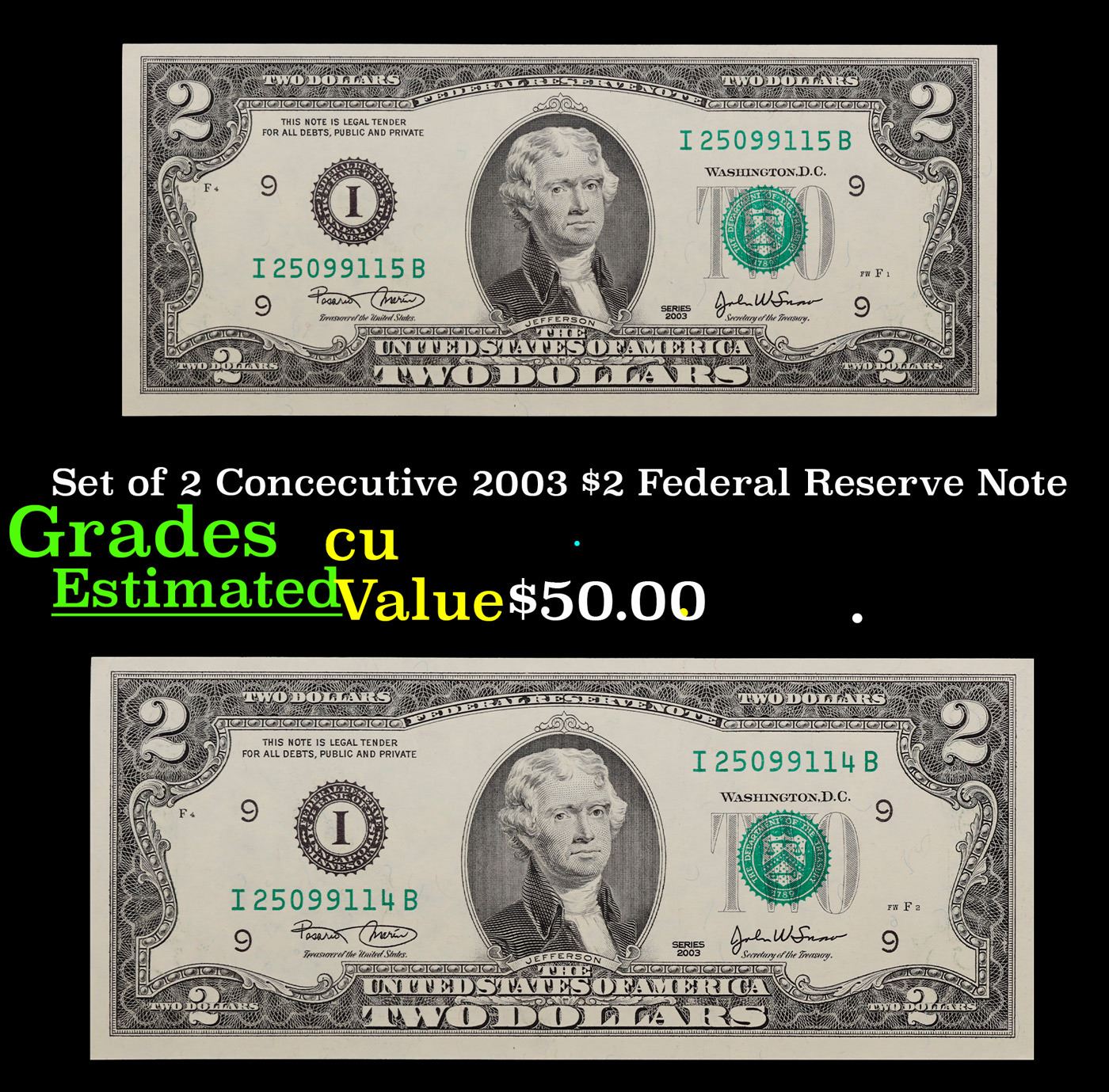 Set of 2 Concecutive 2003 $2 Federal Reserve Note Grades CU.