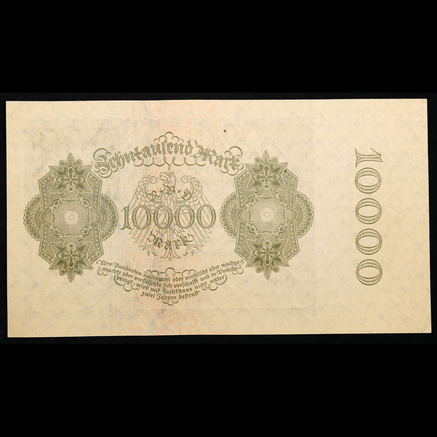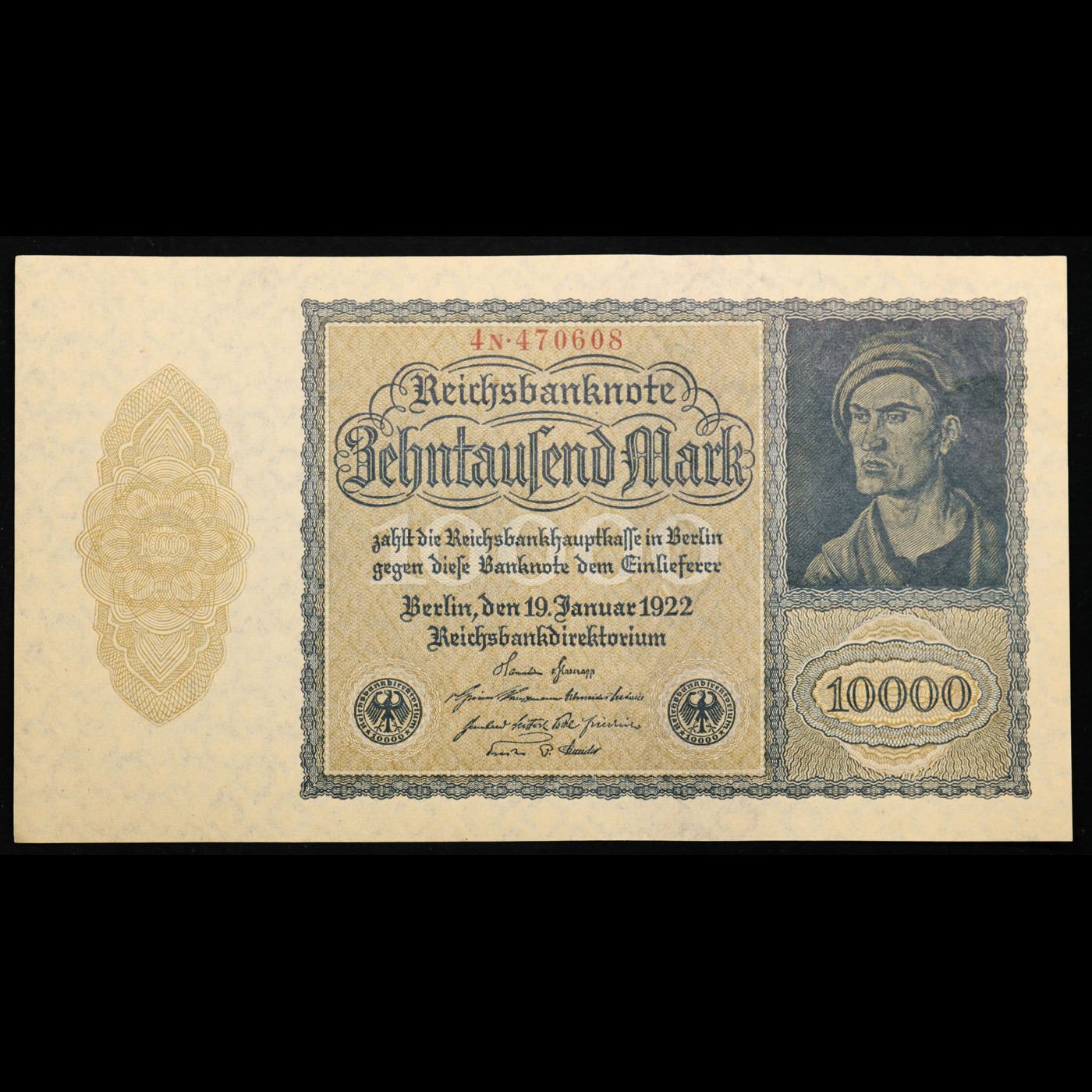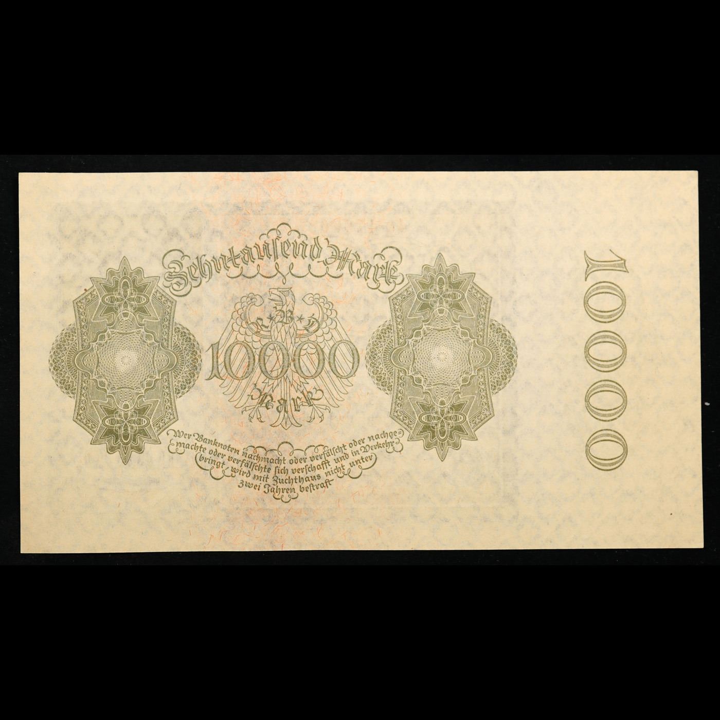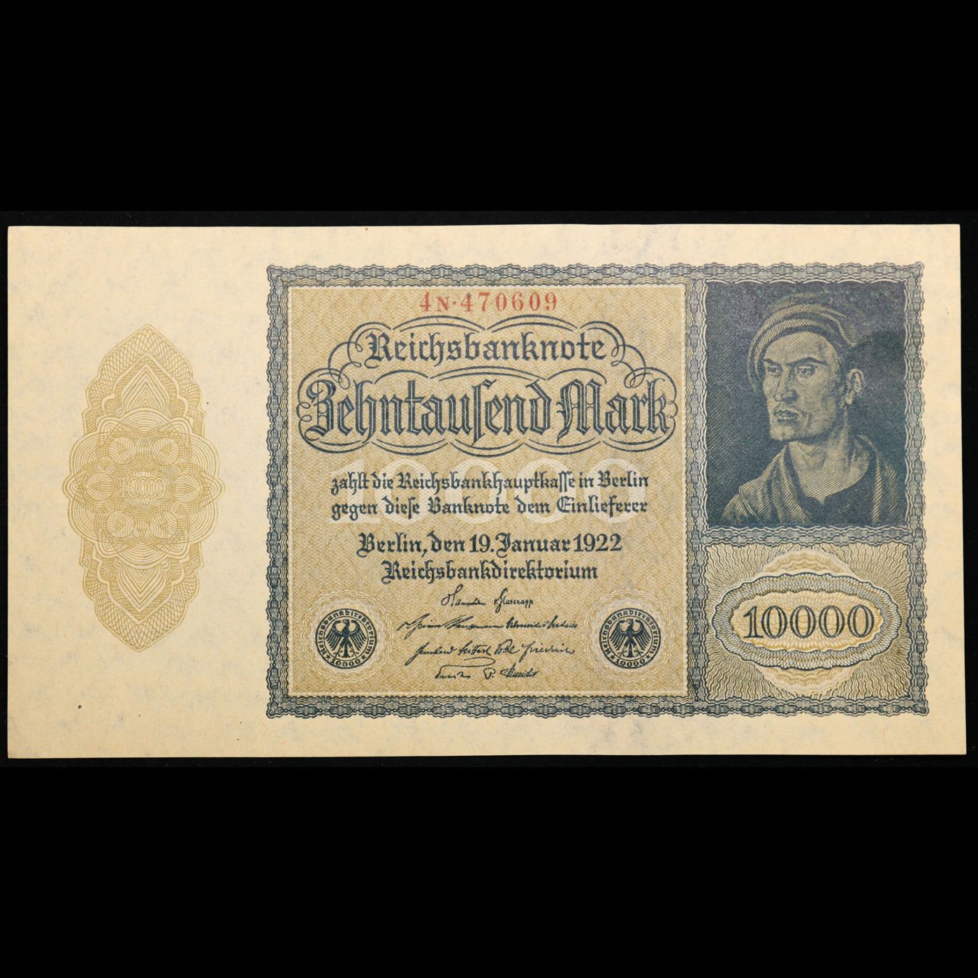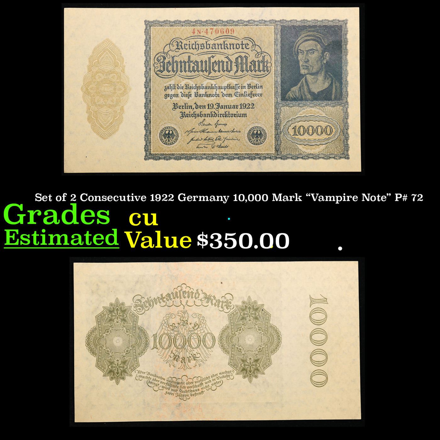 Set of 2 Consecutive 1922 Germany 10,000 Mark "Vampire Note" P# 72 Grades CU. Among the many bills issued during the hyperinflation crisis in the post-WWI German Weimar Republic, the "Vampire Note" is a particular standout. It is known as the Vampire Note because when the note's engraver (identity unknown) adapted a portrait by famous German Renaissance painter Albrecht Durer for the note, he made an odd alteration where the neck of the figure looks like a Vampire when the bill is rotated 90 degrees. It takes some imagination to see, but was intentional and meant to represent the anti-French sentiment in WWI Germany -- France was considered to be "sucking the life out of" the country following the signing of the Treaty of Versailles. The Reichsbank noticed this alteration, but did not change it, printing several varieties of the bill with the design and giving credence to the popular anti-French sentiment. There are three varieties, Pick # 70 and 71 differing in the reverse design, and Pick # 72 being a smaller version of Pick # 71.