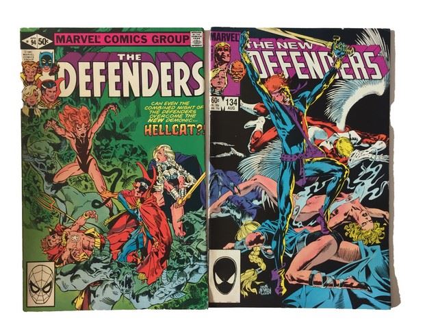 Set of 2 Defenders Comics: The Defenders #94 April 1961 and #134 August 1984. #134 "Manslaughter!" Written by Peter B. Gillis. Art by Don Perlin and Kim DeMulder. Cover by Kevin Nowlan. Cover price $0.60. #94: Cover art by Michael Golden. Beware--The Six-Fingered Hand!, script by J. M. DeMatteis, pencils by Don Perlin (layouts), Joe Sinnott (finished art), and Al Milgrom (finished art), inks by Joe Sinnott (pages 1-5, 7, 14-30) and Al Milgrom (pages 6, 8-12, uncredited); start of The 6-fingered hand storyline; Hostess Twinkies ad with Spider-Man, inks by Joe Sinnott.U. S. Postal Service Statement of Ownership, Management and Circulation; Average no. of copies each issues during preceding 12 months: 306,034. 36 pgs. $0.50. Good condition.