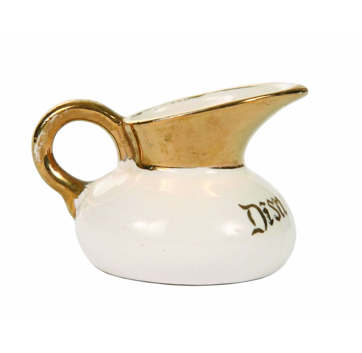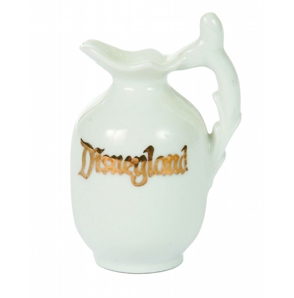 (Disneyland, 1956) A set of (2) miniature vases featuring brilliant gold "Disneyland" text over the cream colored ceramic. Vases measure 1.5" and 2.75" tall. In good condition, with some wear to the paint and ceramic. One vase has an inked date of "2-18-56" on the bottom next to the Disneyland sticker.