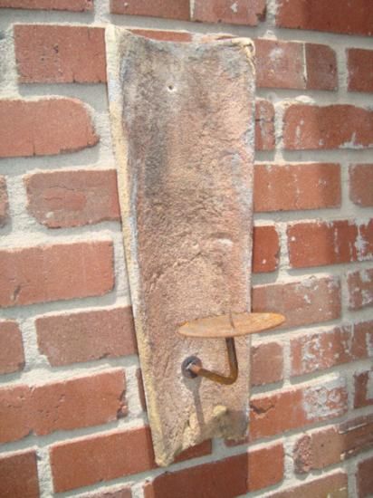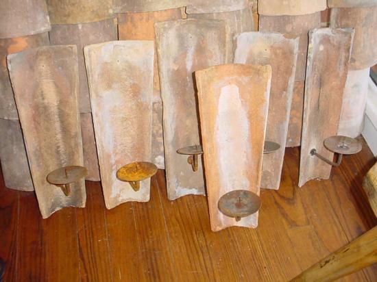 Set of 2 antique roof tile sconces. Antique roof tiles from the South of France. The roof tiles from which these sconces were made were produced in 1820's in South of France. They were the products of women who created the distinctive tapered shape by folding sheets of clay over their thighs. As the thighs vary naturally, so do these tiles (Each tile varies a little since they are handmade). Due to their age, none will be in brand new condition. Sometimes, there are OLD chips but they are antique tiles (not reproduction) which have wear and tear due to their age. Materiel: Terra cotta Our prices are very reasonable because we buy directly in France. h-19"/ w-6.5" We ship from Texas (not from France)!