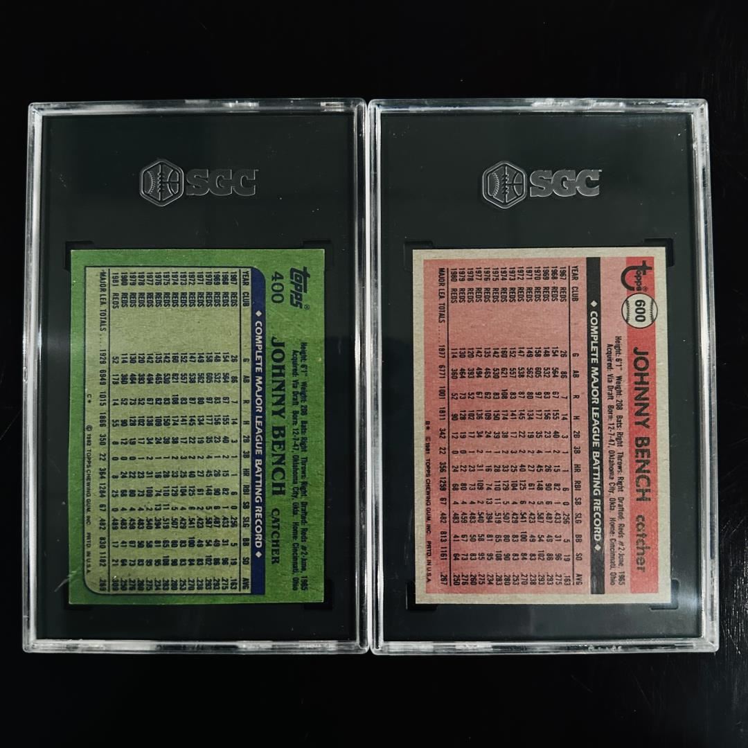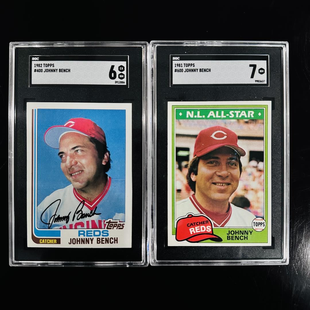 This two-card lot features Hall of Fame catcher Johnny Bench in his later career years with the Cincinnati Reds. Included are the 1982 Topps #400 graded SGC 6 and the 1981 Topps #600 N.L. All-Star card graded SGC 7. Both cards showcase Bench's legacy as one of the greatest catchers in baseball history, housed in clean, professional slabs.