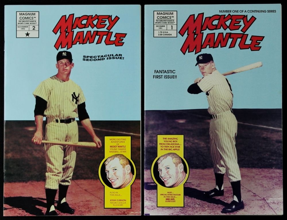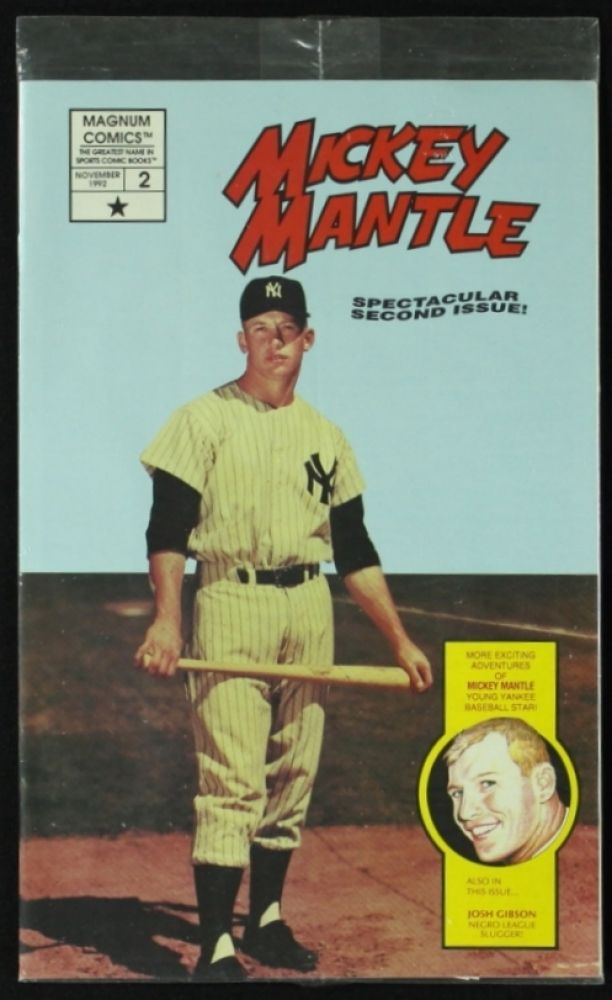 This lot includes a set of (2) Mickey Mantle vintage comic books with issue #1 (December 1991) and #2 (November 1992). Both comics are in in mint condition with #2 sealed in the original bag. The #2 comic book also includes (2) lithograph postcards in the sealed bag with Mickey Mantle and Josh Gibson.