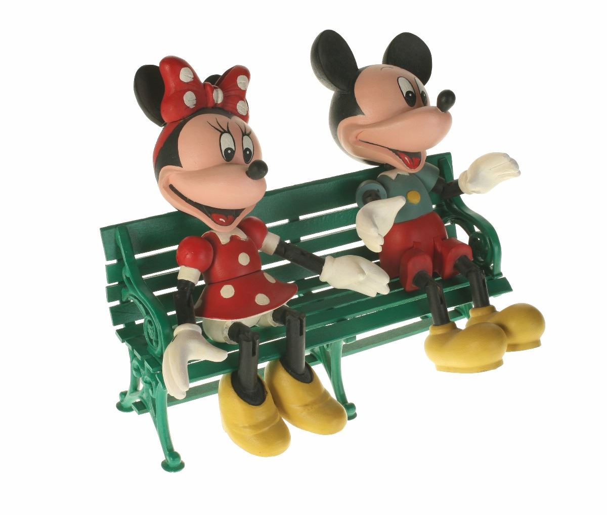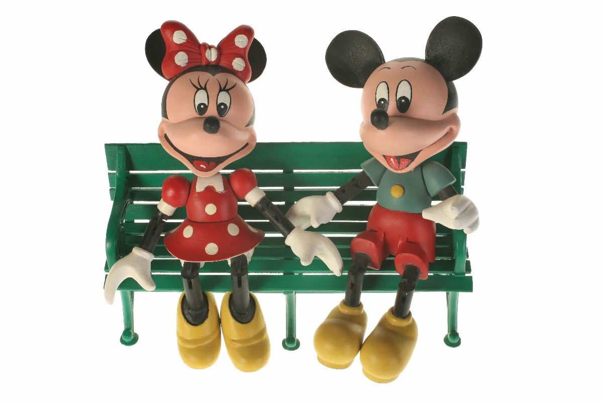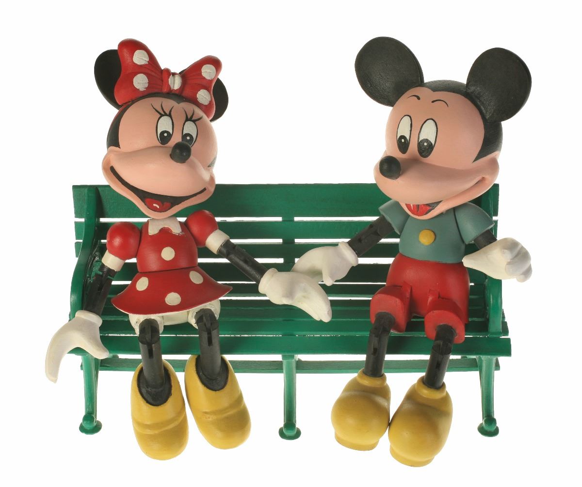 (Disneyland, 1990s) Beautiful set of hand-carved Mickey and Minnie figures with a Disneyland bench, all created for a 1000-piece limited edition to be sold at Disneyland in the 1990s. This set is an Artist's Proof, hand-carved out of solid mahogany with pine faces and hands. The bench is made from painted wood and resin. Mickey and Minnie measure approximately 10" tall while the bench measures 5.5" tall. Set is in good condition with minor wear.