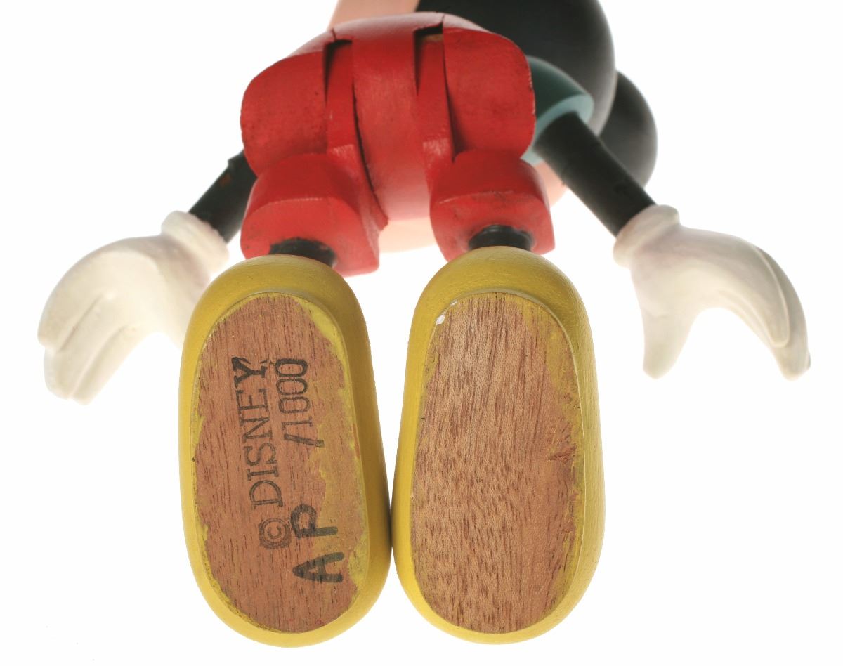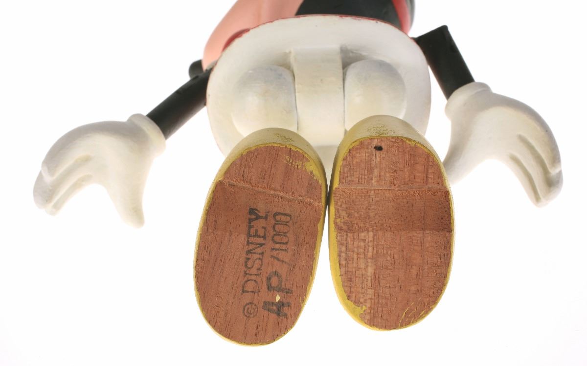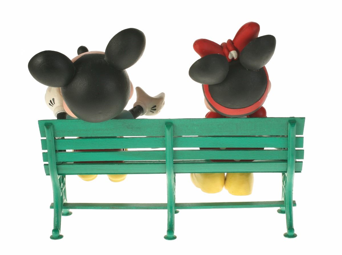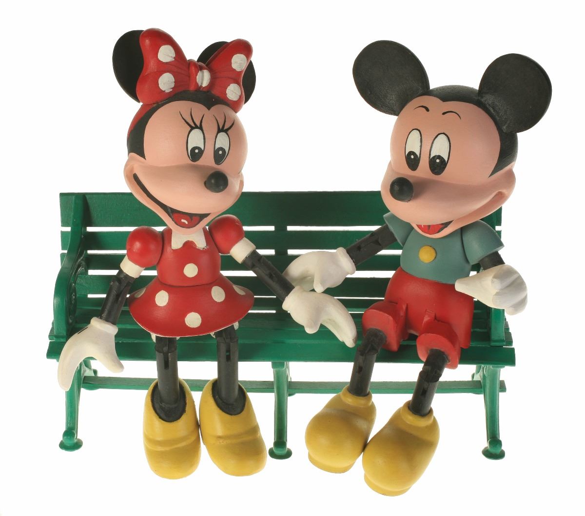 (Disneyland, 1990s) Beautiful set of hand-carved Mickey and Minnie figures with a Disneyland bench, all created for a 1000-piece limited edition to be sold at Disneyland in the 1990s. This set is an Artist's Proof, hand-carved out of solid mahogany with pine faces and hands. The bench is made from painted wood and resin. Mickey and Minnie measure approximately 10" tall while the bench measures 5.5" tall. Set is in good condition with minor wear.