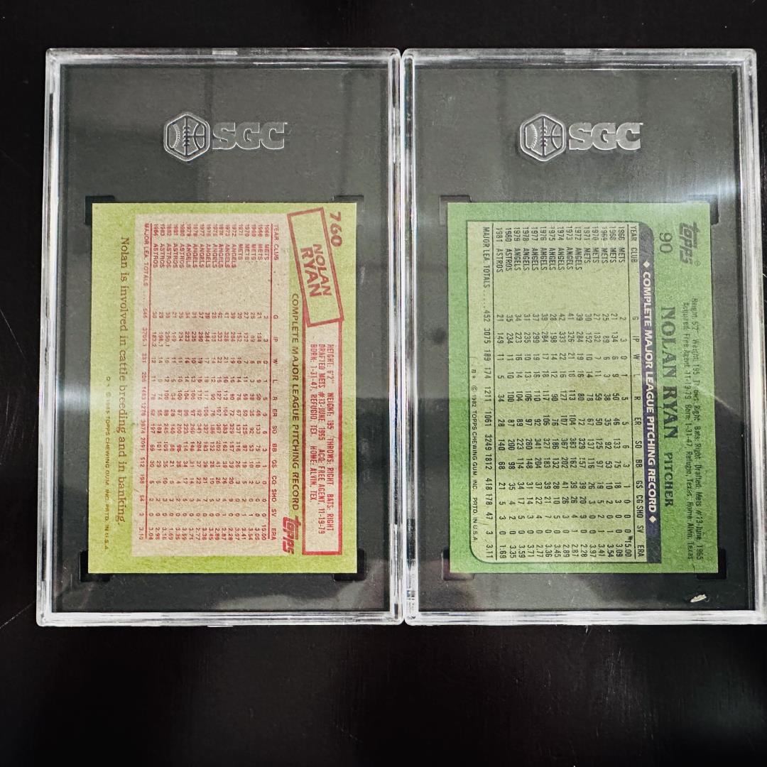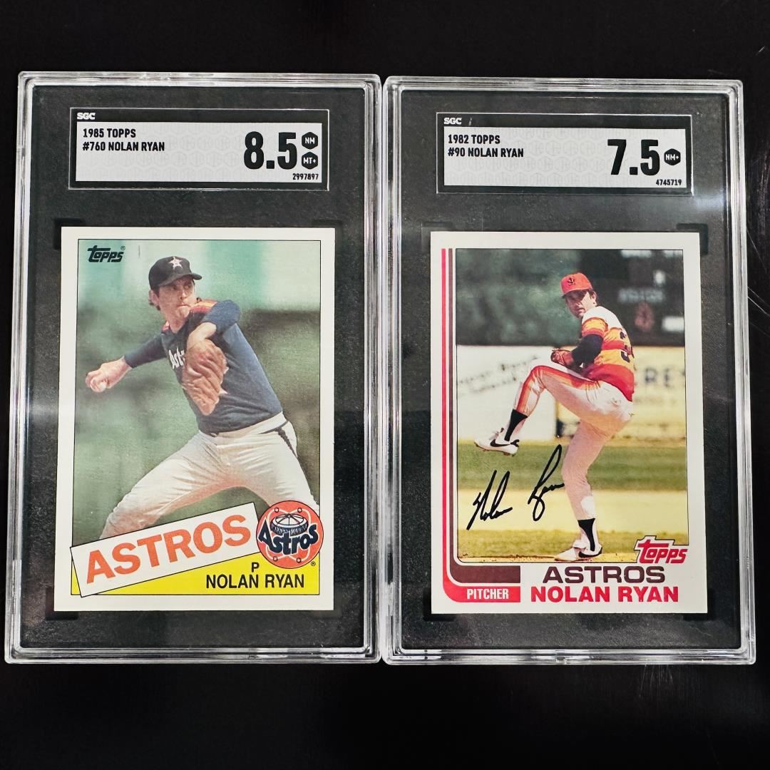 This set features two classic Topps baseball cards of Hall of Fame pitcher Nolan Ryan, both showcasing his time with the Houston Astros. Included are a 1985 Topps #760 graded SGC 8.5 NM-MT and a 1982 Topps #90 graded SGC 7.5 NM+. These professionally graded cards highlight Ryan's iconic pitching form and are preserved in protective slabs, perfect for any serious vintage baseball card collector. Strong grades and crisp images make this a standout pair from the early '80s era.