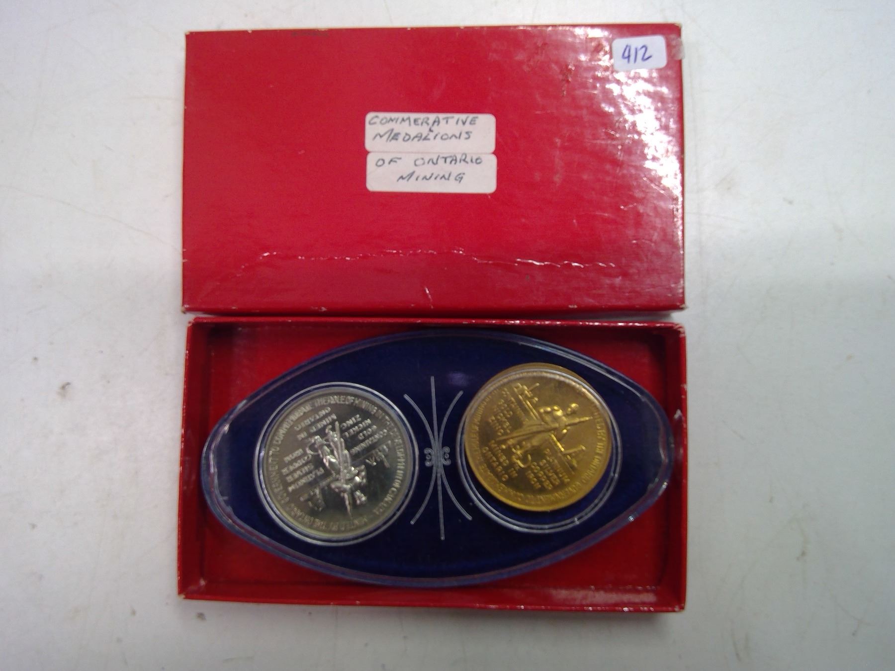 Set of 2 Ontario Government medals to commemorate the role of mining in the development of Canada. Each medal contains: Platinum, Gold, Silver, Nickel, Copper, Zinc & Iron. Housed in a hard plastic holder & original box.
