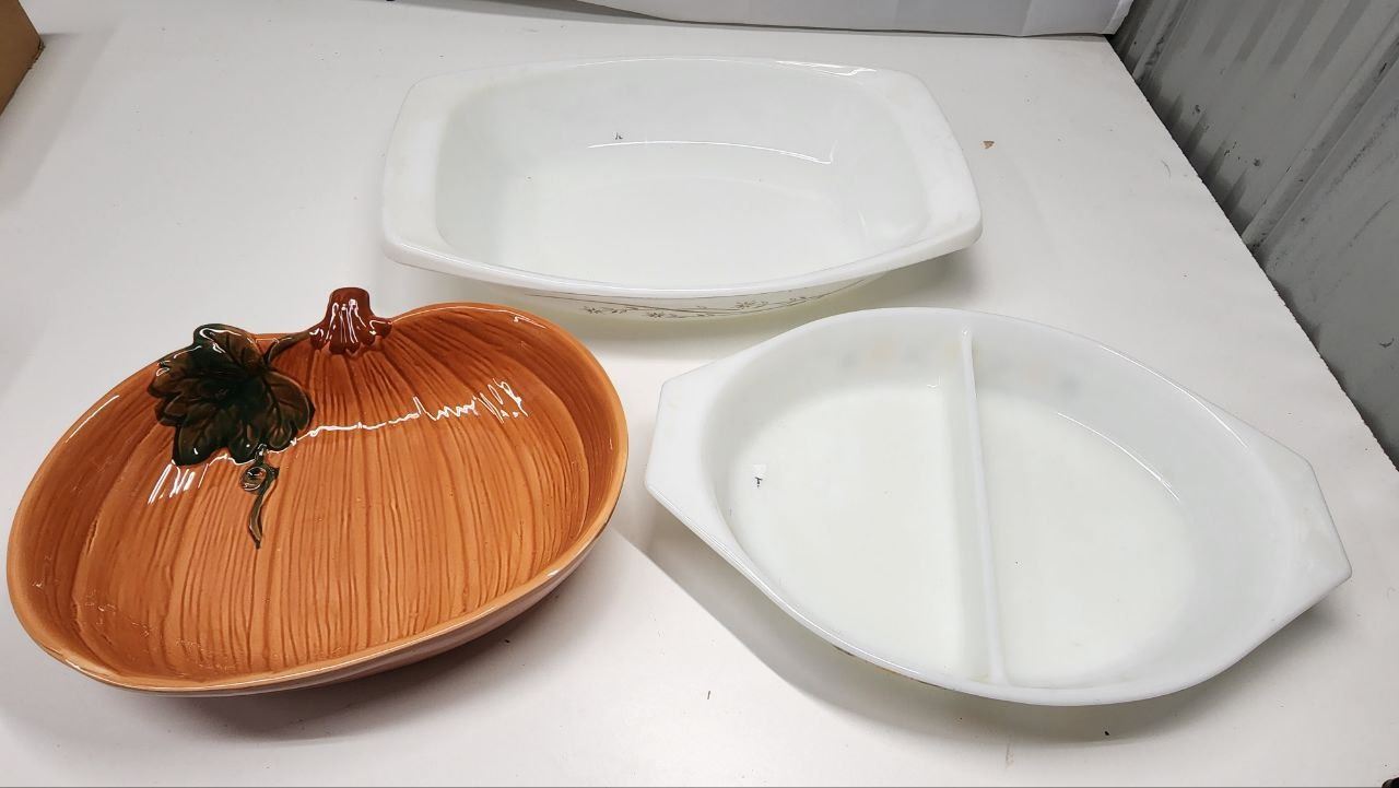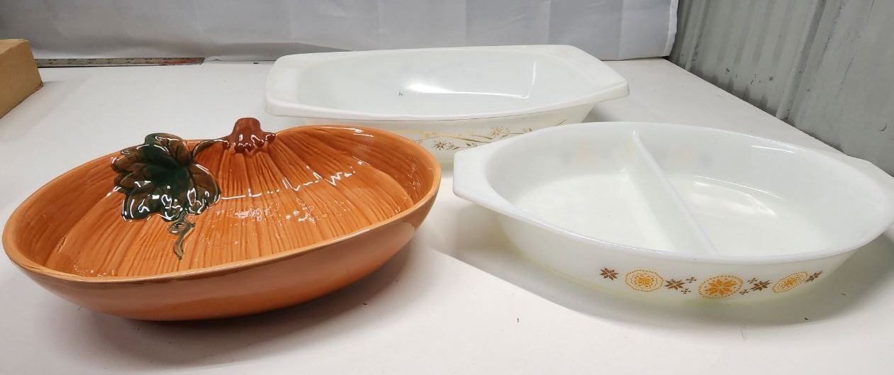 Set of 2 Pyrex Cooking dishes (Large - 2 1/2 Qt & Split - 1 1/2 Qt) and Pumpkin platter dish