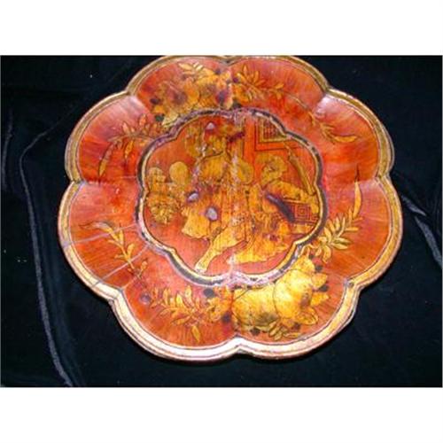 This set of 2 Circa 1890 Chinese Wedding Plates are made of fir wood. The design in the center of the larger plate has been worn off but the design around the scalloped edge is in wonderful condition. It has beautiful birds and flowers in goldleaf with black accents. This plate measures approx. 14 1/2" in diam. The smaller plate measures approx. 13" in diam. and is in excellent condition. There are 2 Chinese figures in the center in goldleaf. Around the edges of this plate are large flowers and peaches in goldleaf. The shape of these plates represent the eight great celestials of Buddhism. Both plates have the customs validation sticker on the back.