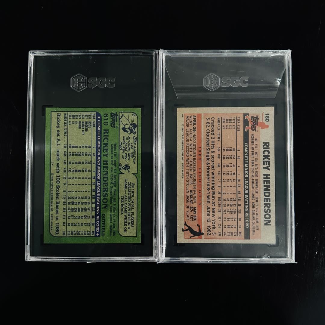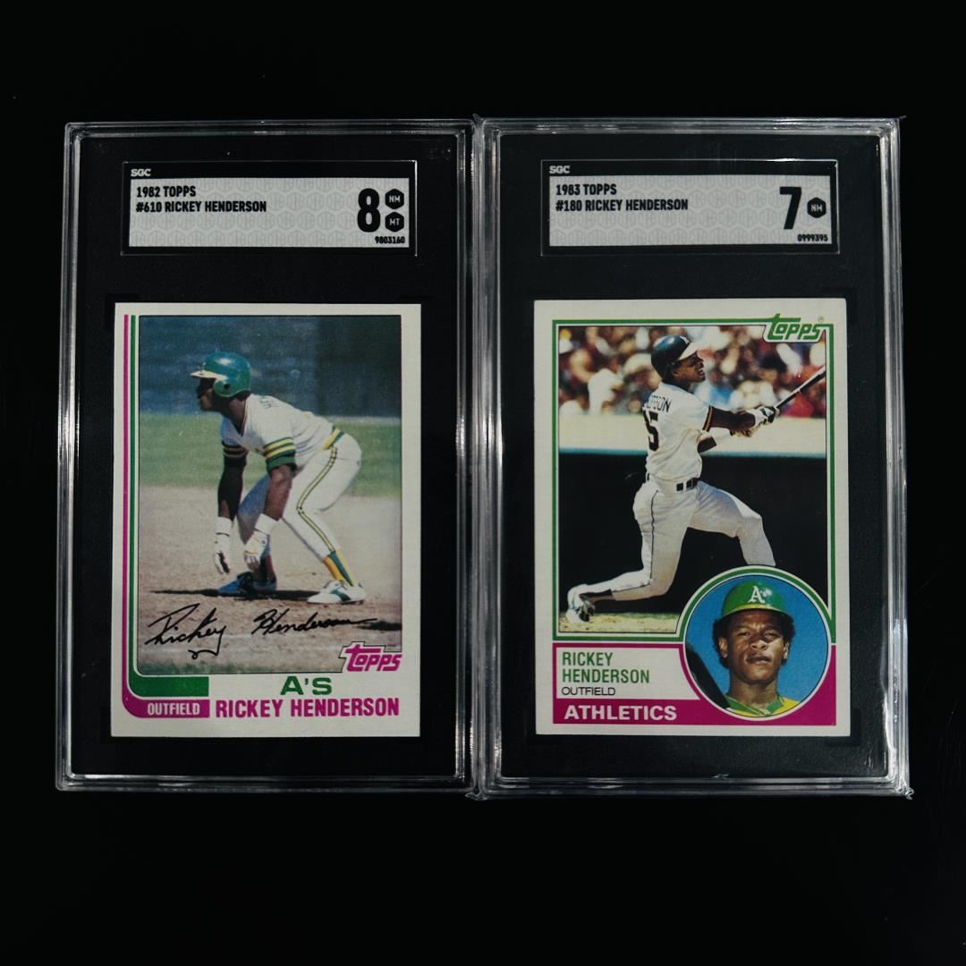 This two-card set features Rickey Henderson in back-to-back early '80s Topps releases, both professionally graded by SGC. Included are the 1982 Topps #610 graded 8 NM-MT and the 1983 Topps #180 graded 7 NM. Both cards capture the speedster in action with the Oakland Athletics and are well-preserved in hard cases for display or investment.