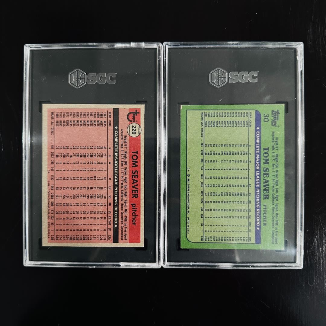 This duo features MLB legend Tom Seaver on two early '80s Topps cards. The 1981 Topps #220 is graded SGC 8 NM-MT, and the 1982 Topps #30 is graded SGC 7 NM. Both cards depict Seaver in his Cincinnati Reds uniform and are preserved in high-quality grading slabs, perfect for collectors of vintage Hall of Famers.