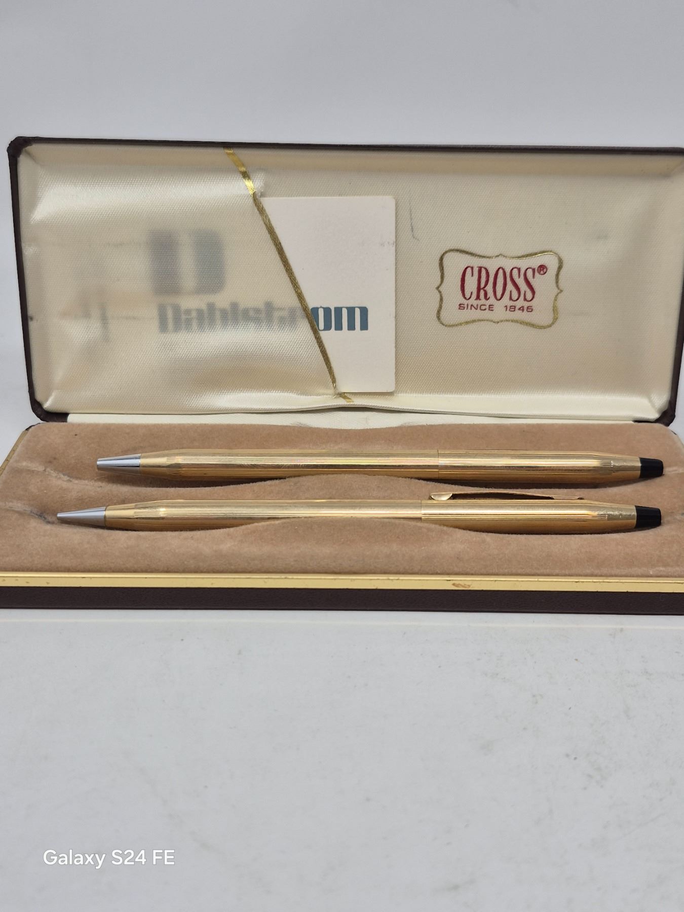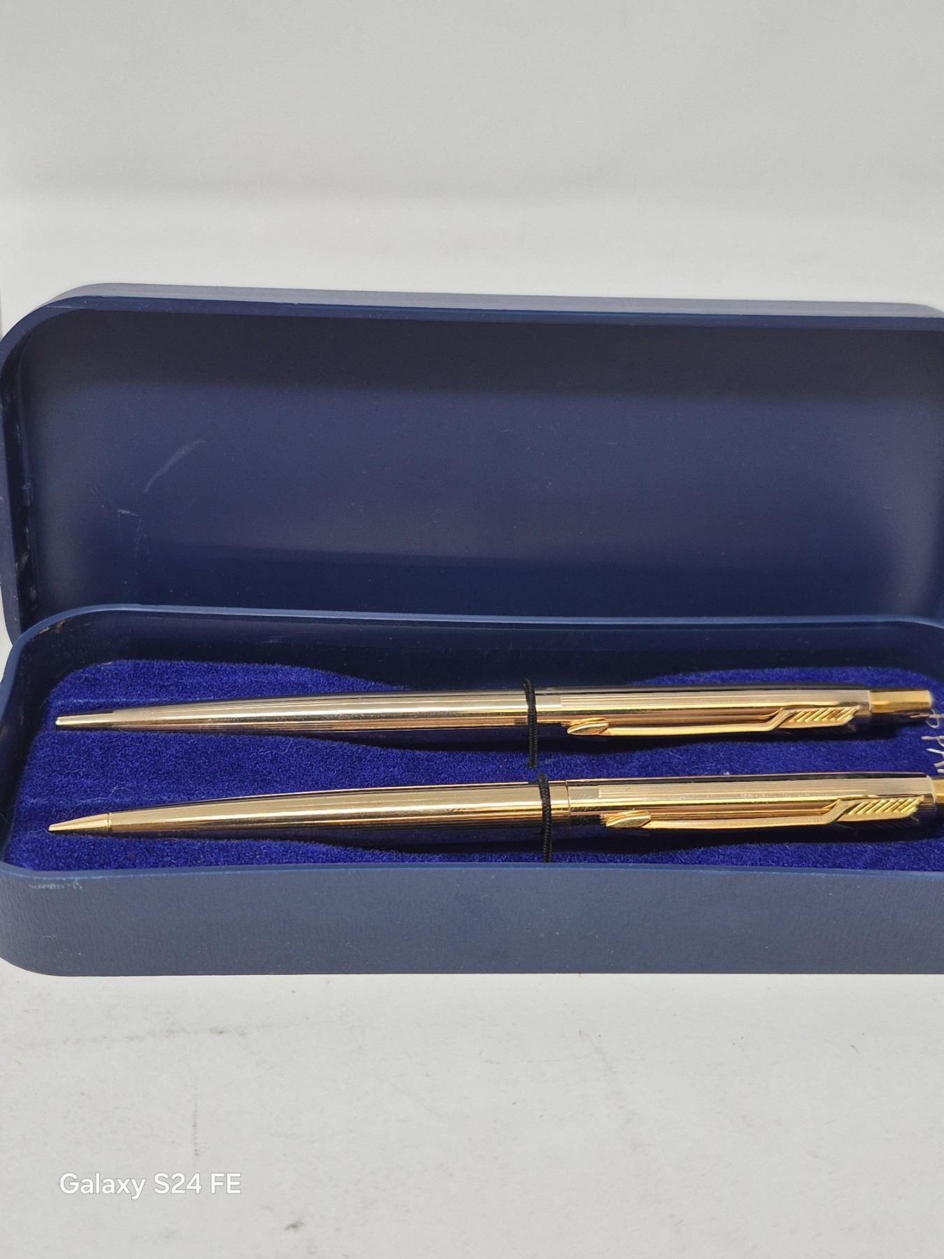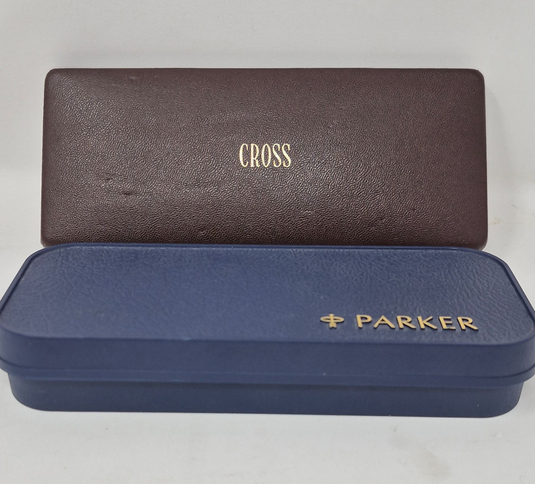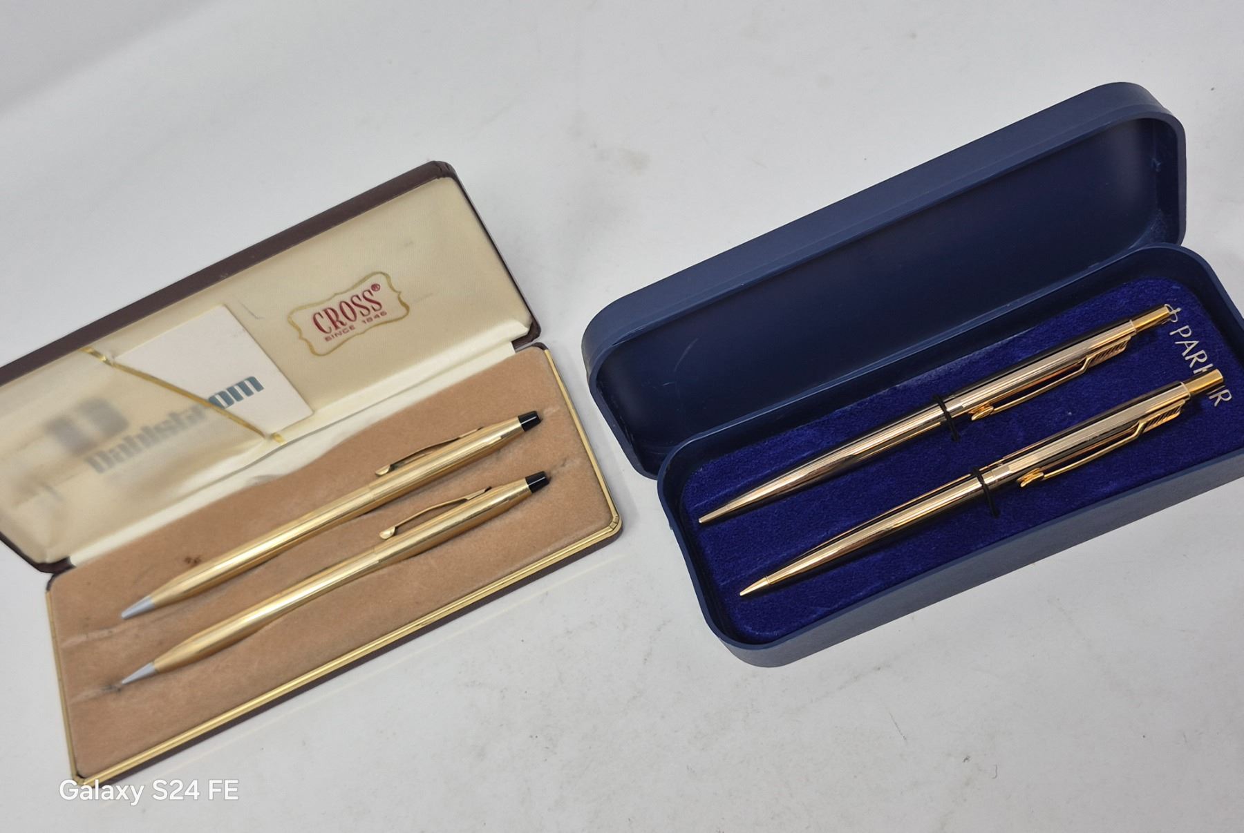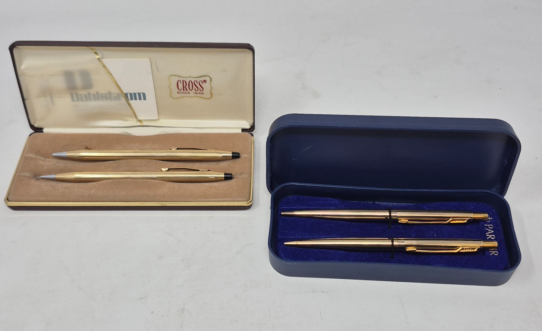 Both sets include a gold-tone ballpoint pen and mechanical pencil in original cases. Cross case marked “Dahlstrom”; Parker case has blue velvet interior.