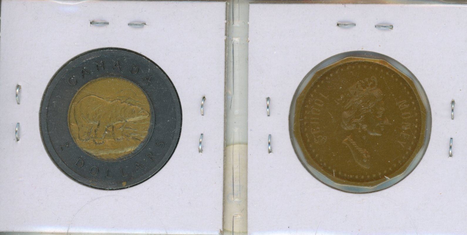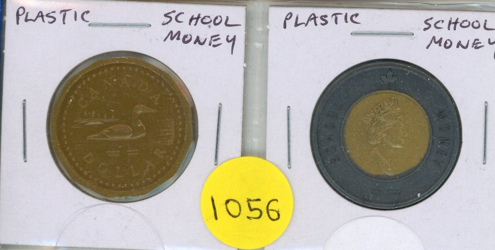 Set of 2 plastic Canadian School Money depicting a Loonie and a Toonie.