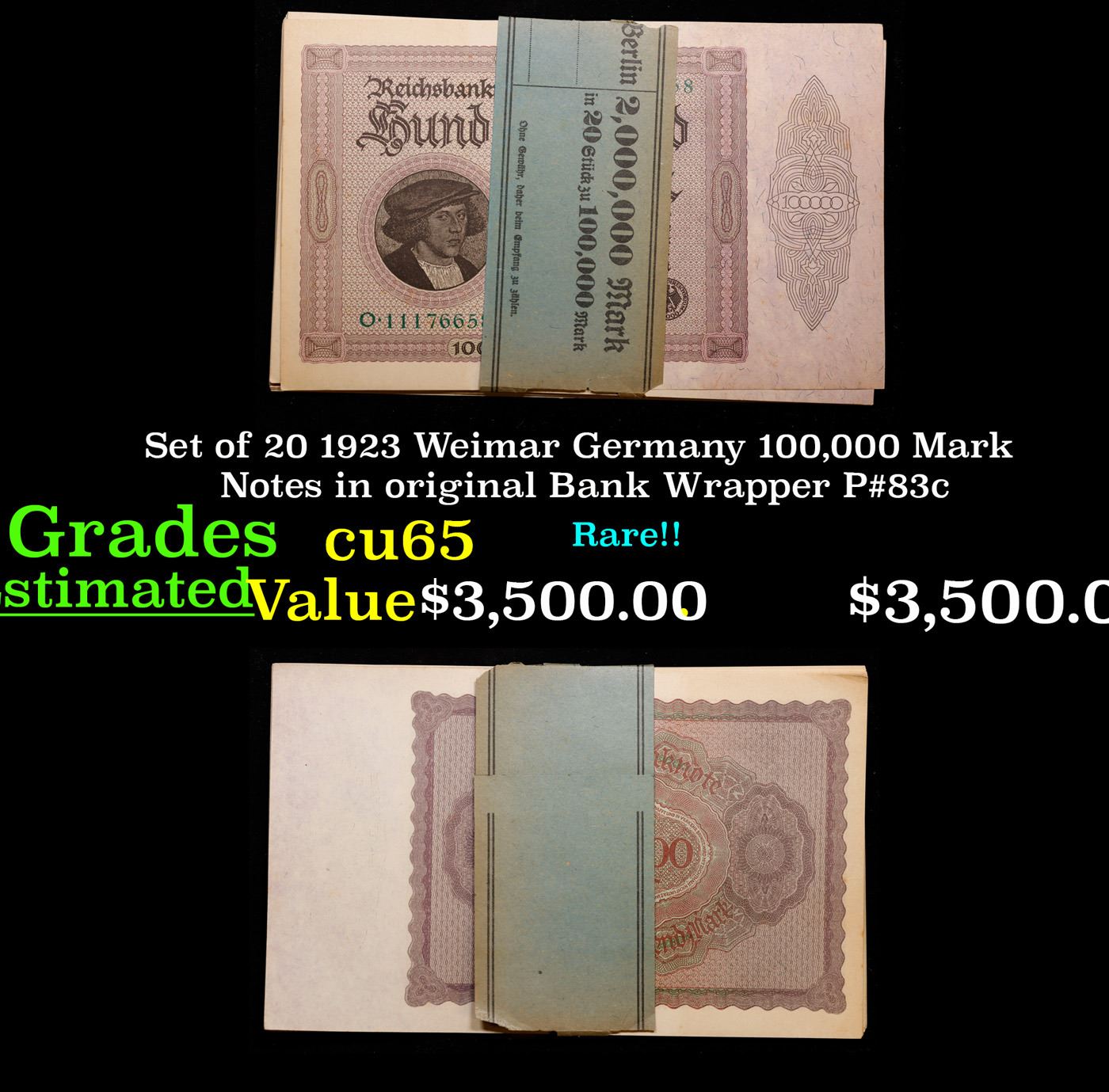 Set of 20 1923 Weimar Germany 100,000 Mark Notes in original Bank Wrapper P#83c Grades Gem CU