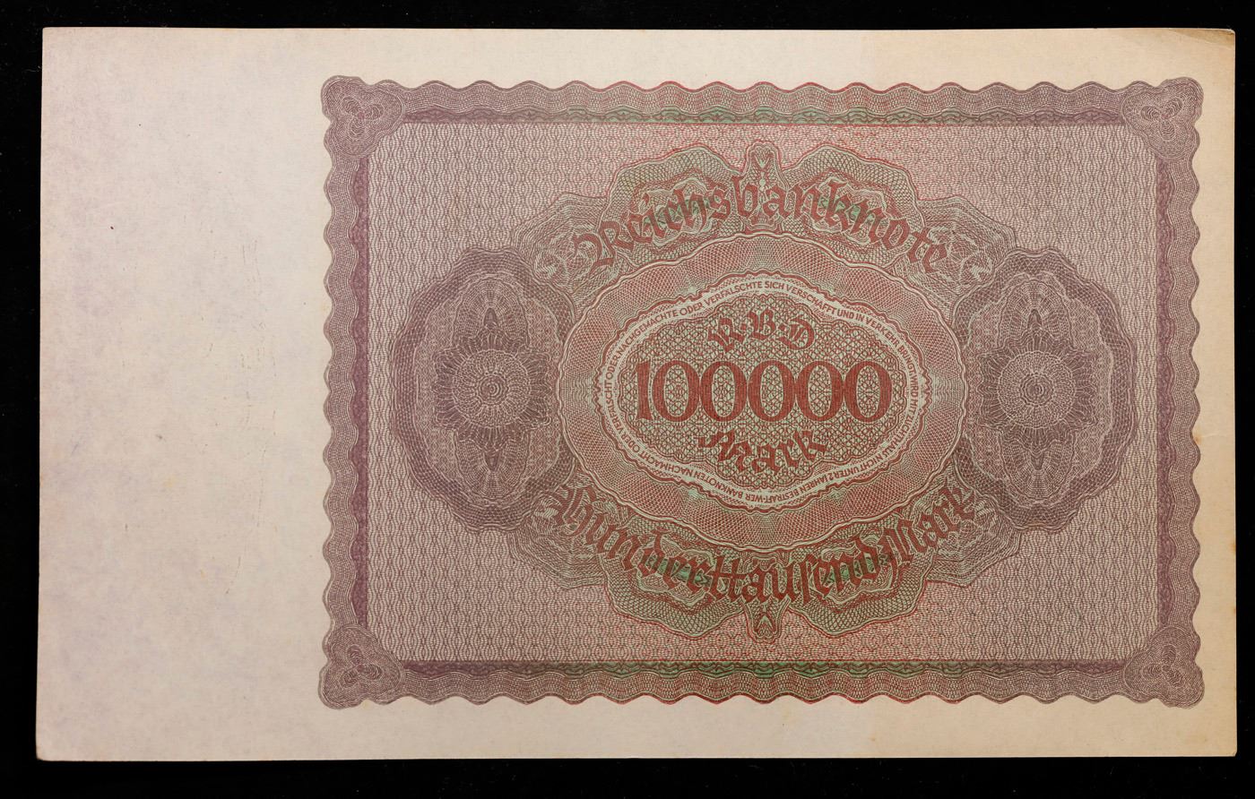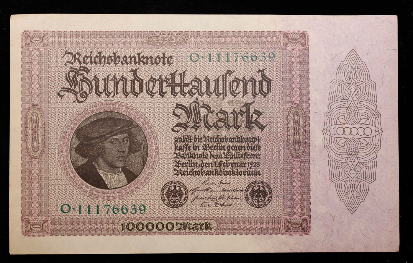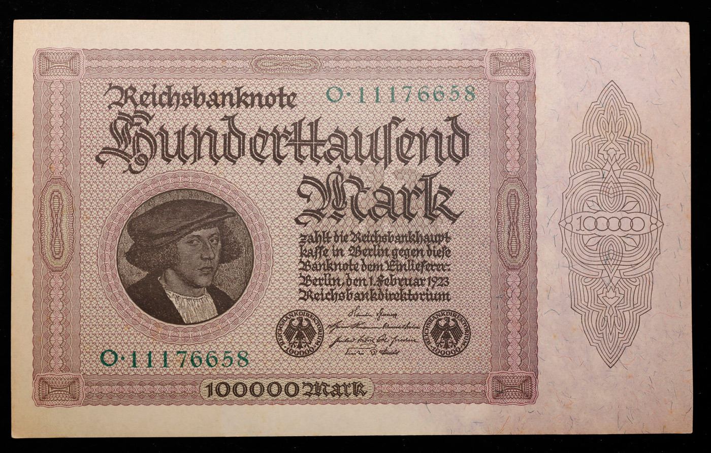 Set of 20 1923 Weimar Germany 100,000 Mark Notes in original Bank Wrapper P#83c Grades Gem CU. In the early 1920s, post-WWI Germany saw its economy spiraling out of control. Hyperinflation started directly after the war in 1918, but truly took over the Weimar Republic from 1921 to 1923. The value of the Mark declined incredibly rapidly. 1 USD was equal to 50 German Marks at the beginning of 1920. Toward the end of 1923, 1 USD was equal to over 4,200,000,000,000 German Marks. At times, denominations of the Mark became less valuable than the paper and labor to print it almost immediately after printing. Thus, denominations of the Mark notes became incredibly large, ending up in the tens of trillions.
