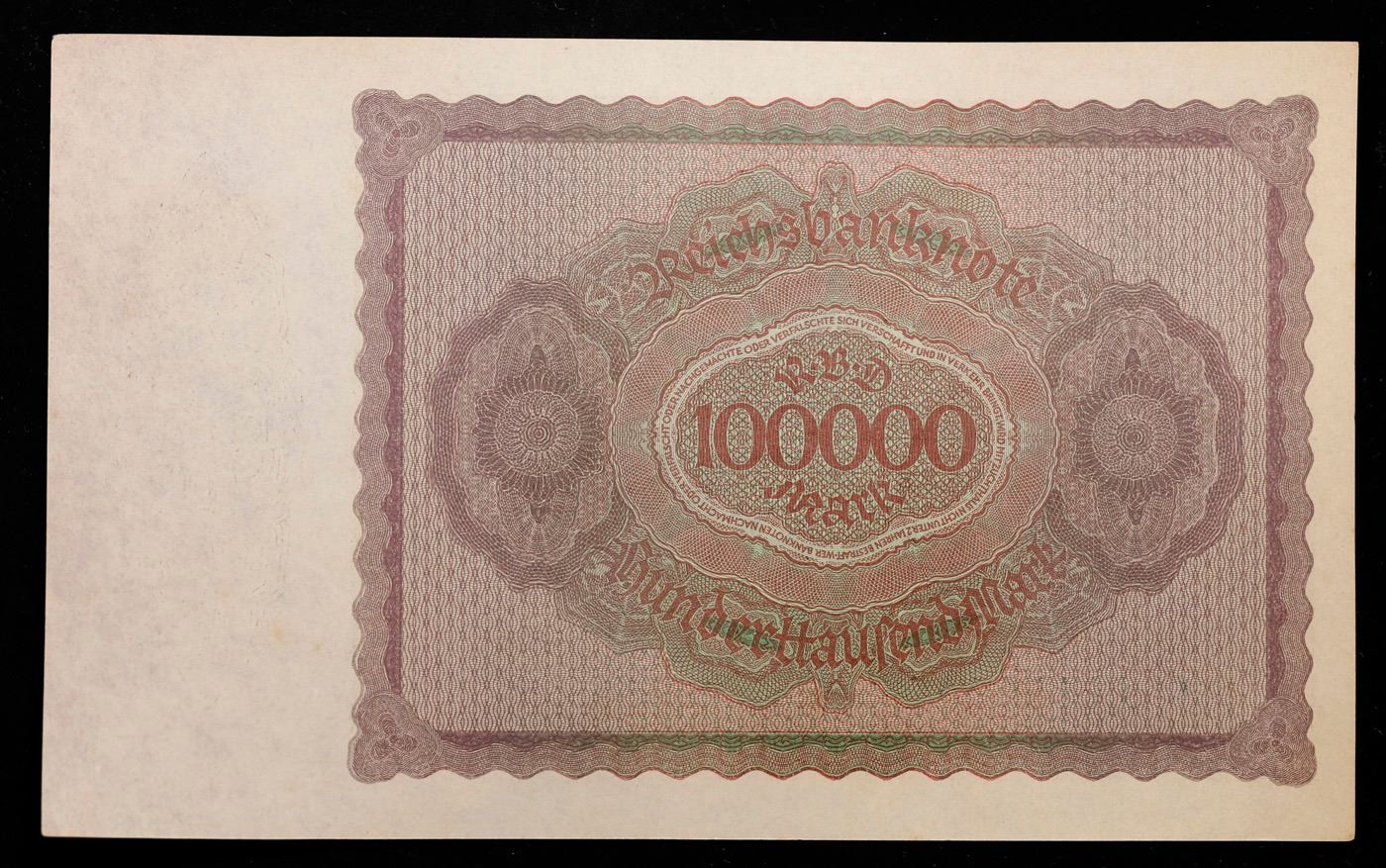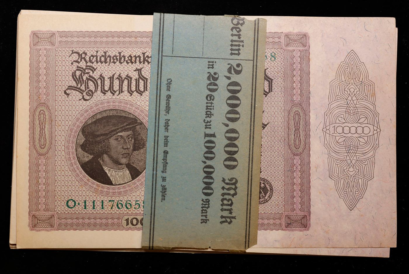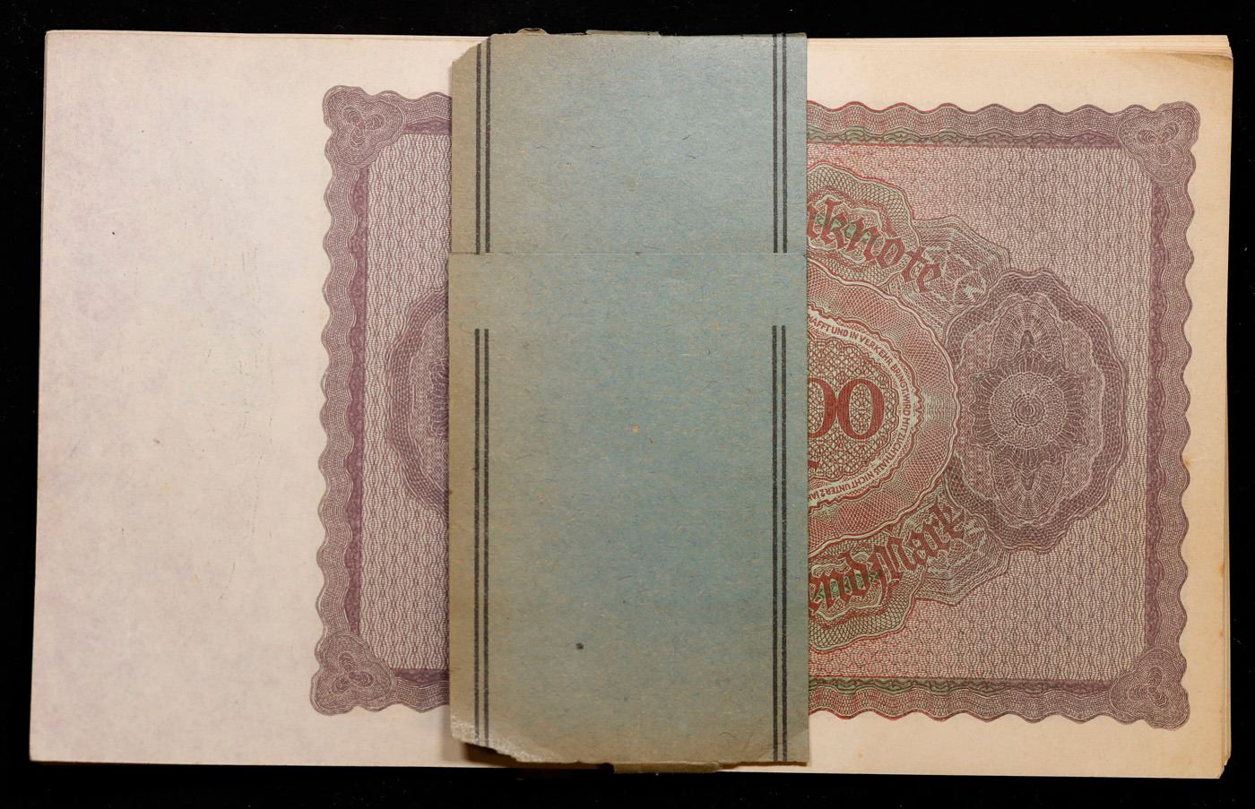 Set of 20 1923 Weimar Germany 100,000 Mark Notes in original Bank Wrapper P#83c Grades Gem CU. In the early 1920s, post-WWI Germany saw its economy spiraling out of control. Hyperinflation started directly after the war in 1918, but truly took over the Weimar Republic from 1921 to 1923. The value of the Mark declined incredibly rapidly. 1 USD was equal to 50 German Marks at the beginning of 1920. Toward the end of 1923, 1 USD was equal to over 4,200,000,000,000 German Marks. At times, denominations of the Mark became less valuable than the paper and labor to print it almost immediately after printing. Thus, denominations of the Mark notes became incredibly large, ending up in the tens of trillions.