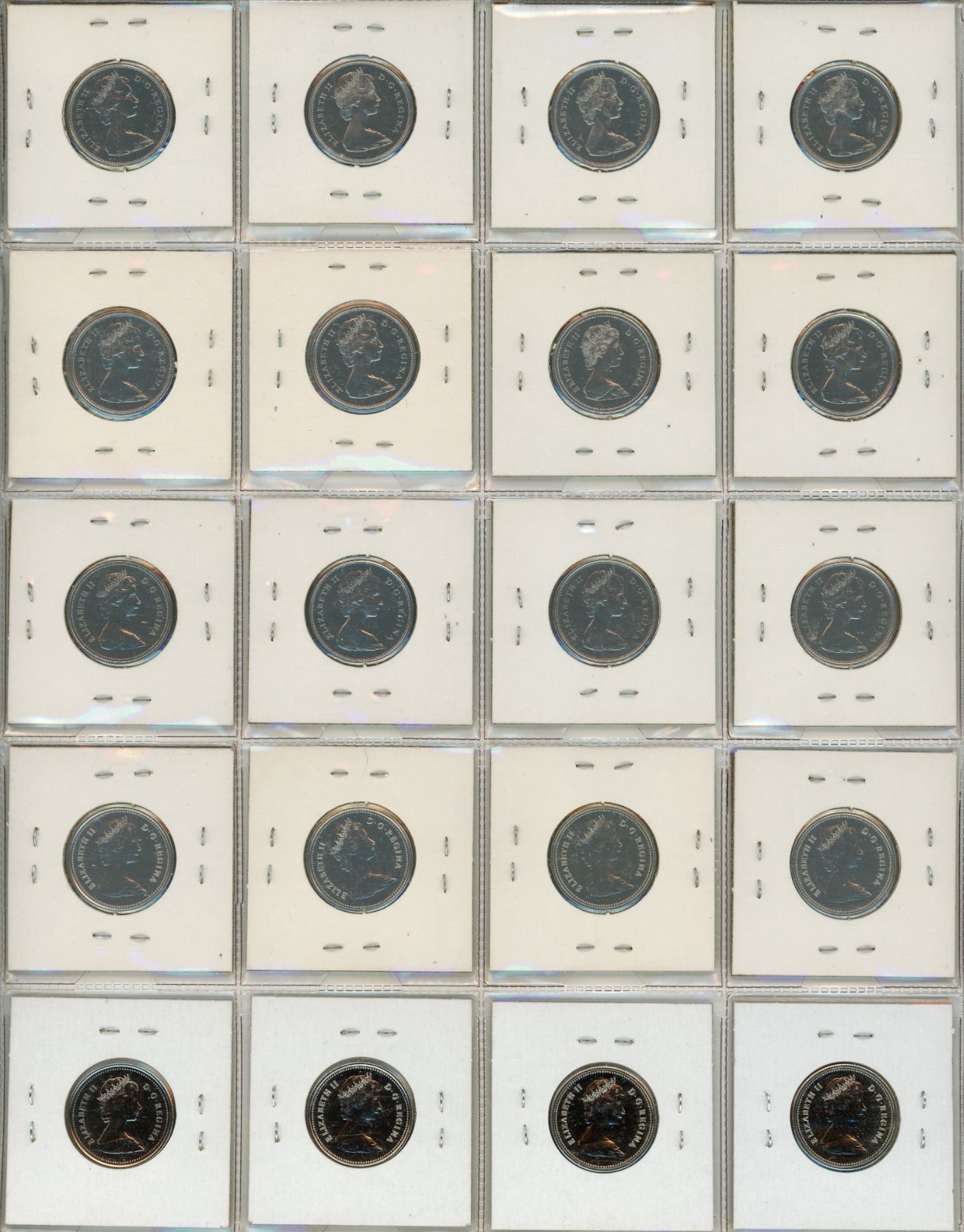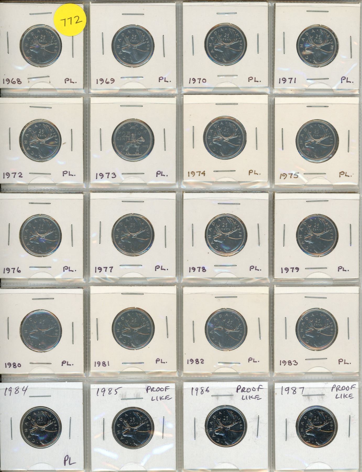 Set of 20 Canadian Proof Like 25 Cents dating from 1968 to 1987. All taken from PL sets.