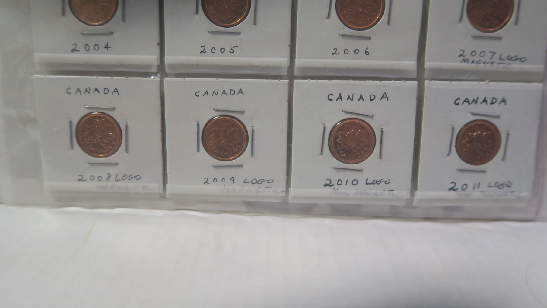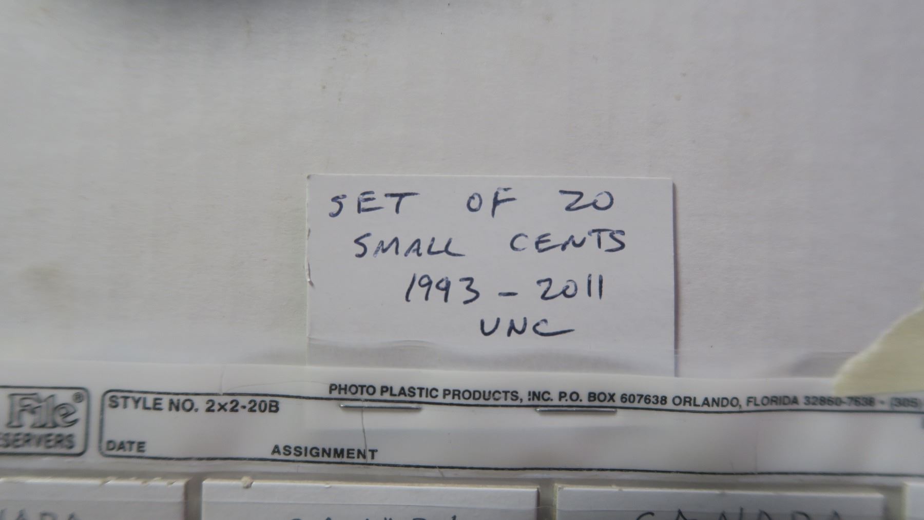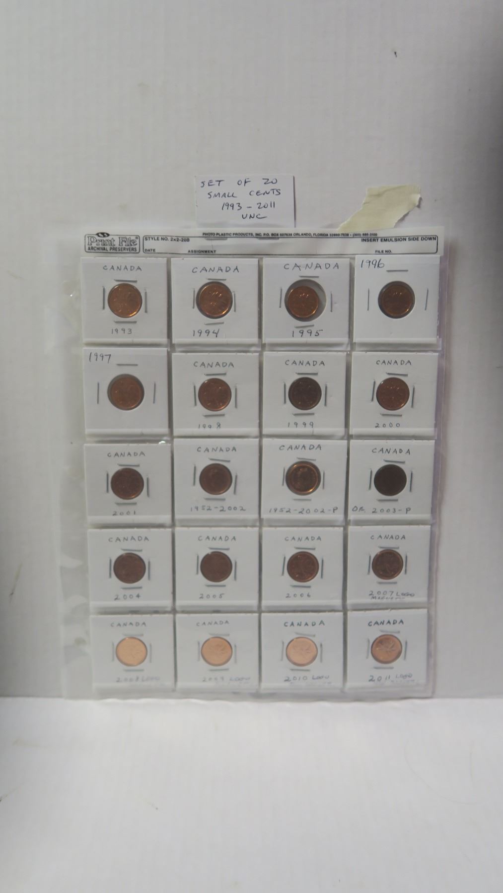Set of 20 Uncirculated Canadian Small Cents. Includes 1993, 1994, 1995, 1996, 1997, 1998, 1999, 2000, 2001, 2002, 2002P, 2003P, 2004, 2005, 2006, 2007 Logo magnetic, 2008 Logo, 2009 Logo, 2010 Logo & 2011 Logo. All are Uncirculated or BU Red. A nice selection.