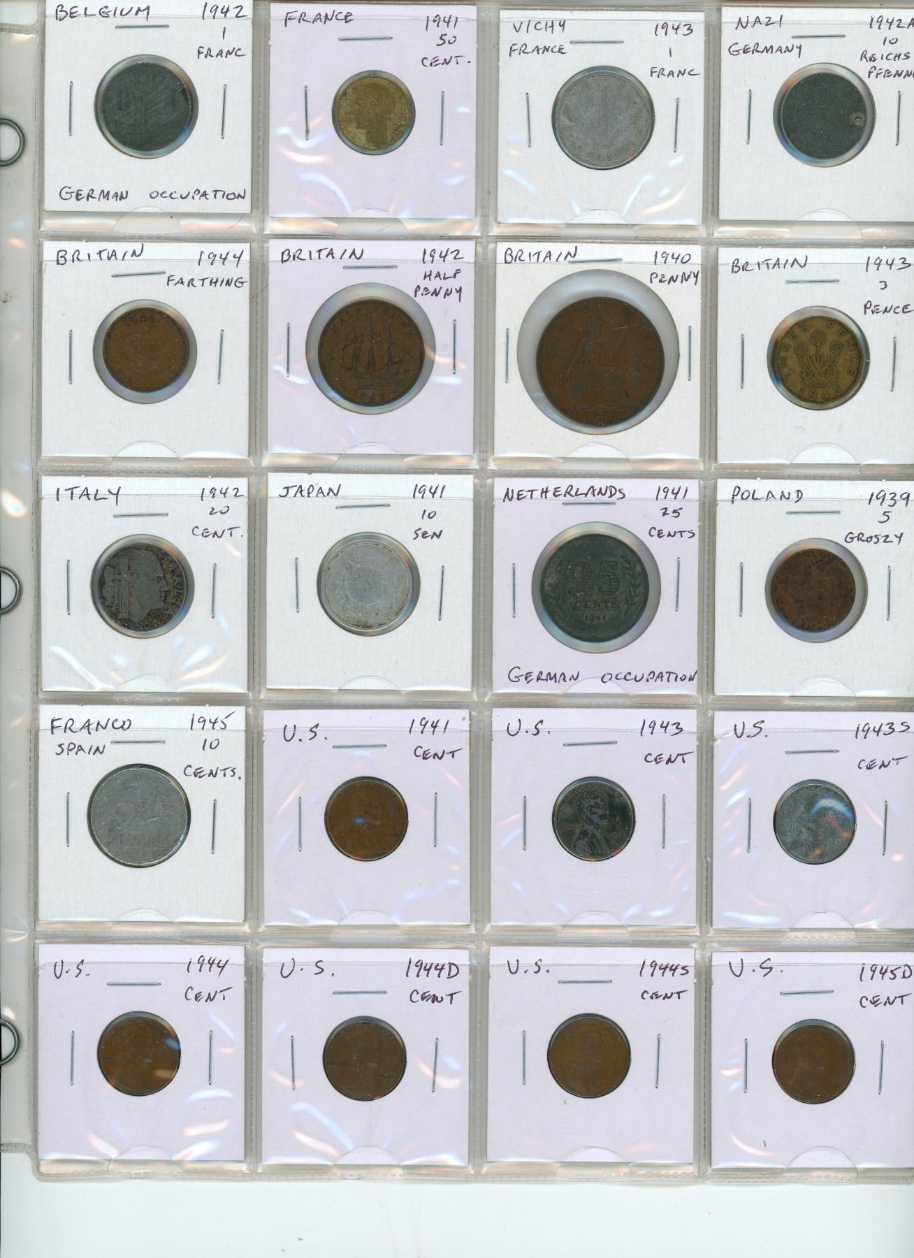 Set of 20 World War II Coins From Belgium, France, Nazi Germany, Great Britain, Italy, Japan, Netherlands, Poland, Spain, USA