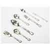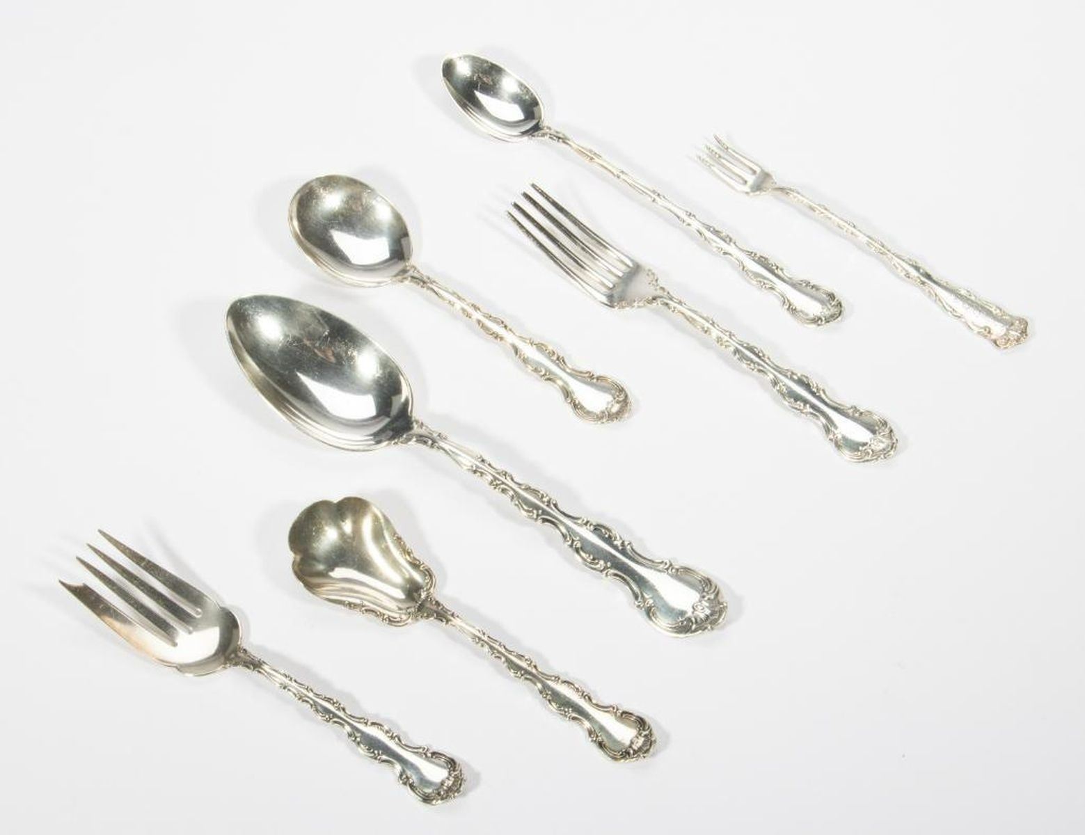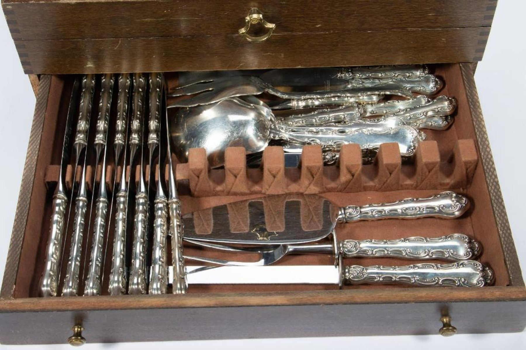 "Strasbourg" pattern set in box, comprising 12 dinner forks, 12 dessert forks, 12 teaspoons, 5 jelly spoons, 8 soup spoons, 8 sundae spoons, 11 pickle/shrimp forks, 3 serving spoons, 9 serving pieces, 1 tong, 1 olive spoon, 12 knives, 9 butter knives, carving set, 1 cake server. The knives, cake, and carving set have stainless steel blades. 3,235 grams (without stainless steel pieces).