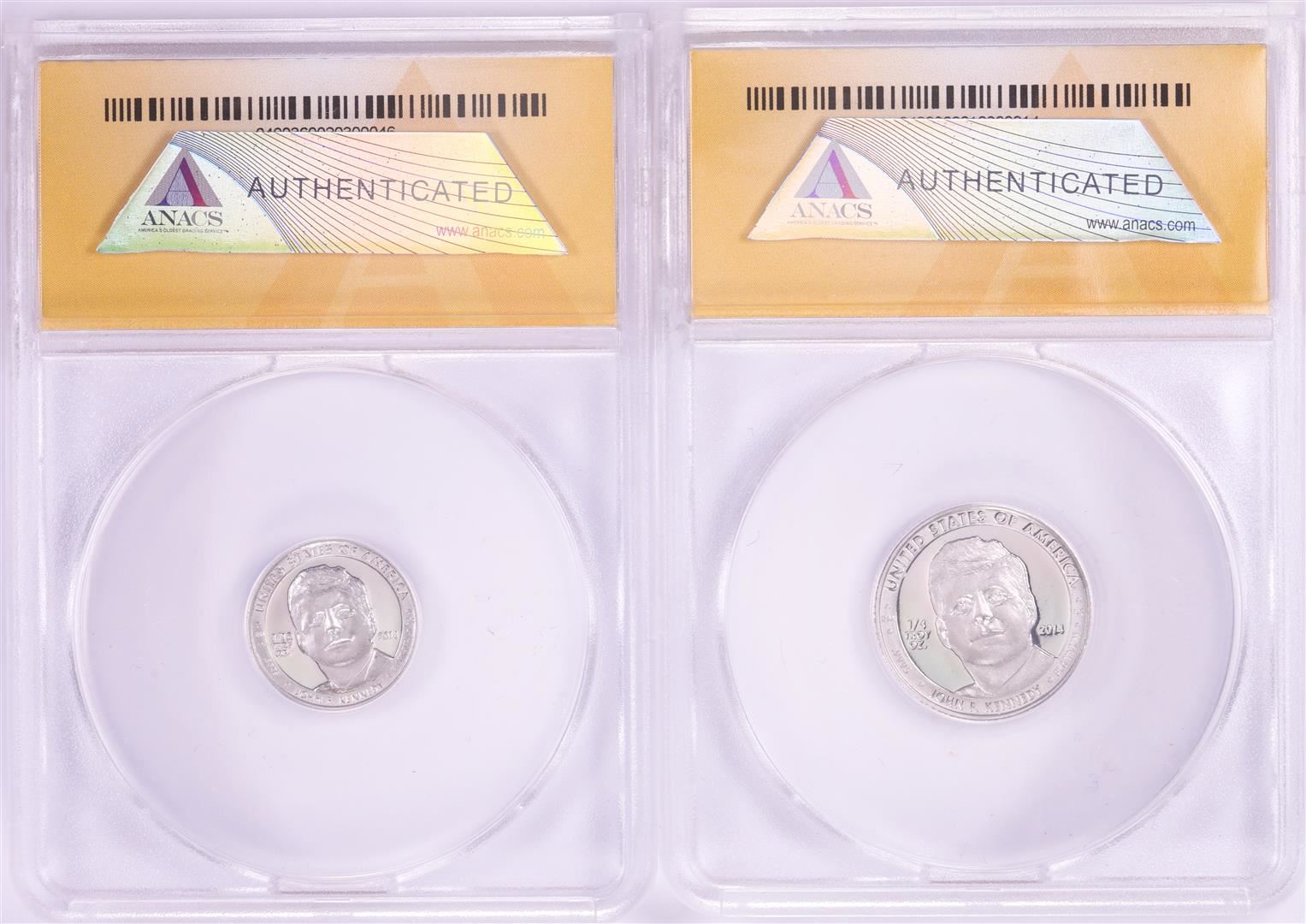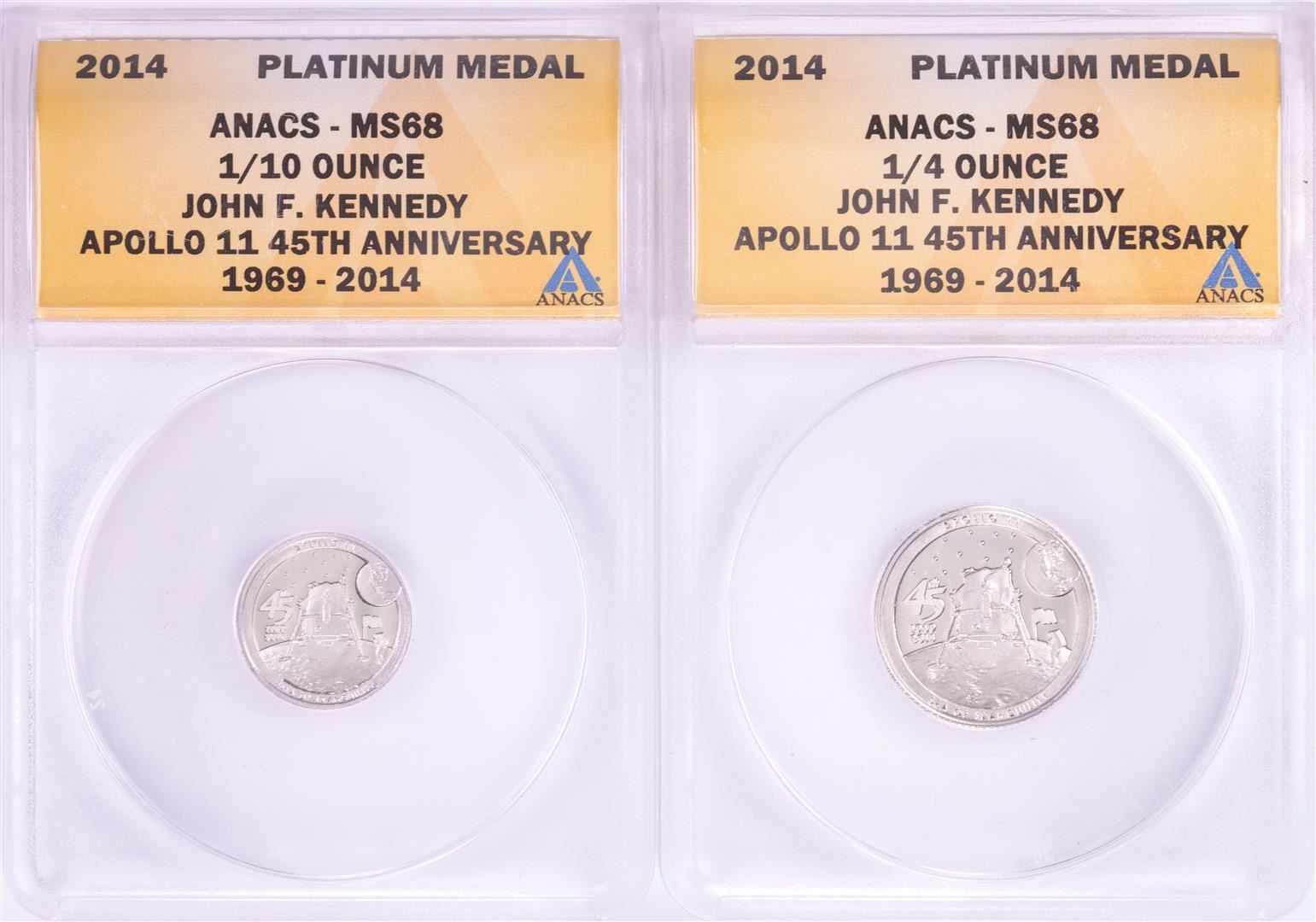 One Set of 2014 Proof 1/10 & 1/4 oz Platinum JFK Apollo 11 Anniversary Medals ANACS MS68. ANACS Certified.