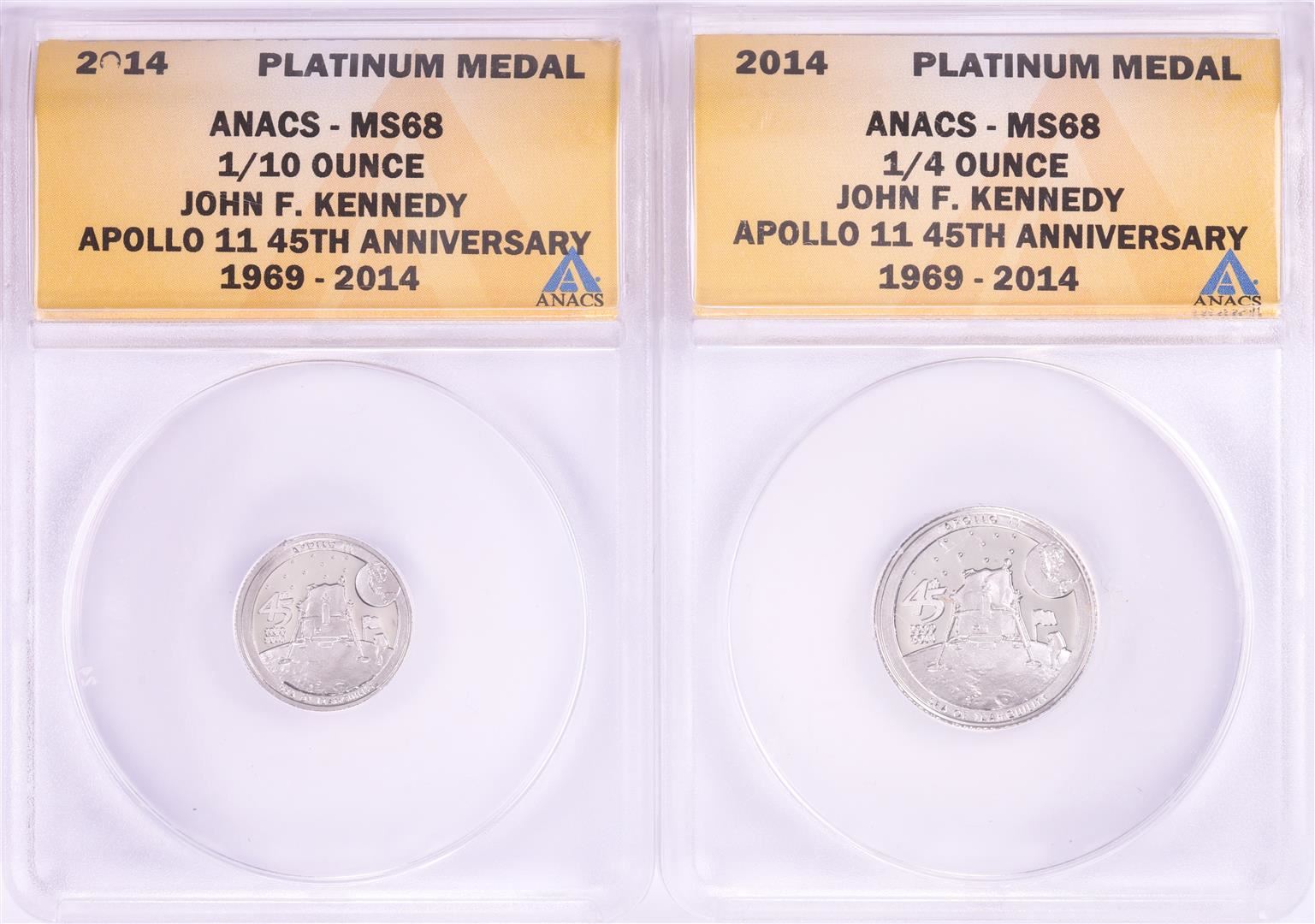One Set of 2014 Proof 1/10 & 1/4 oz Platinum JFK Apollo 11 Anniversary Medals ANACS MS68. ANACS Certified.