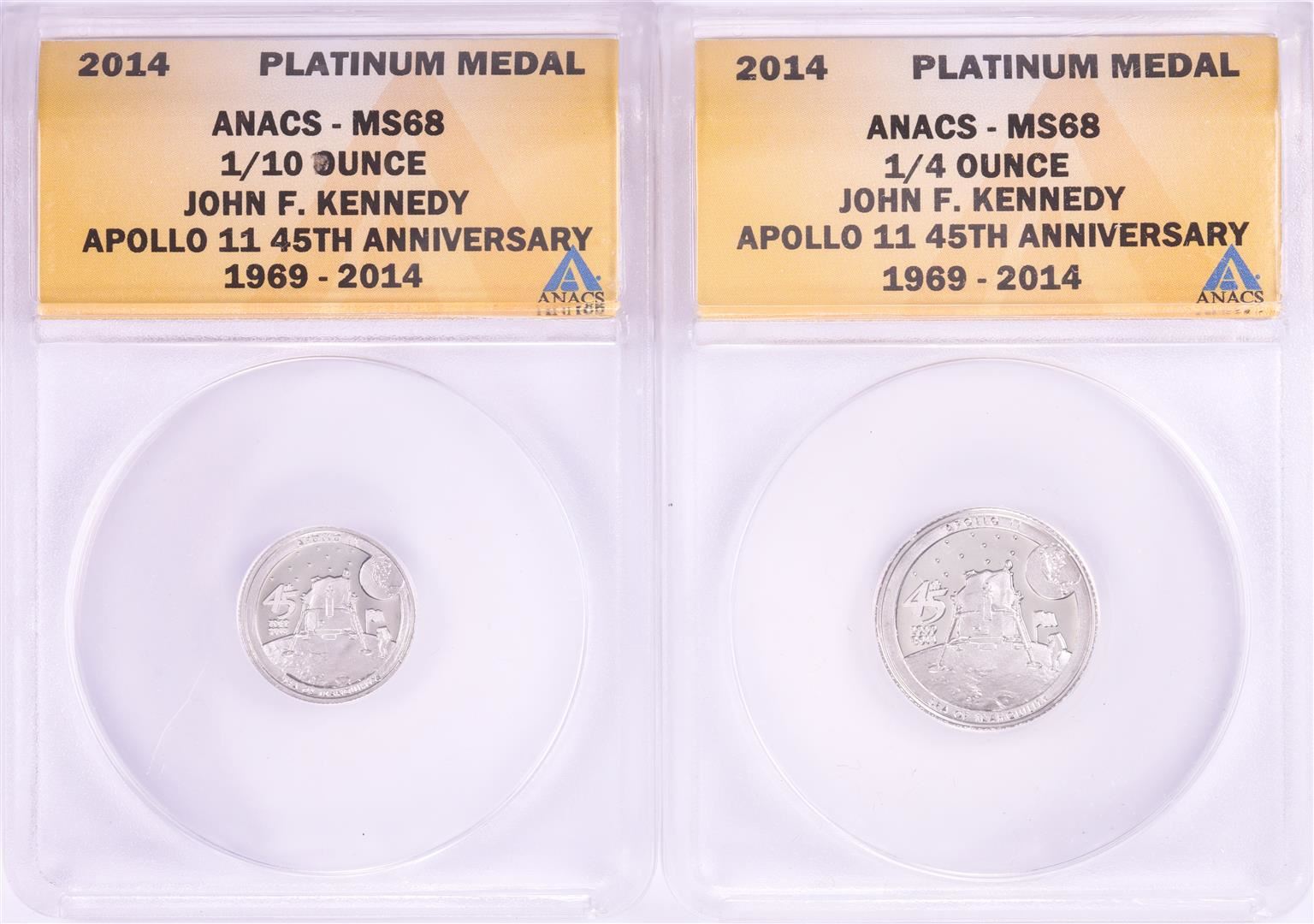 Set of 2014 Proof 1/10 & 1/4 oz Platinum JFK Apollo 11 Anniversary Medals ANACS MS68