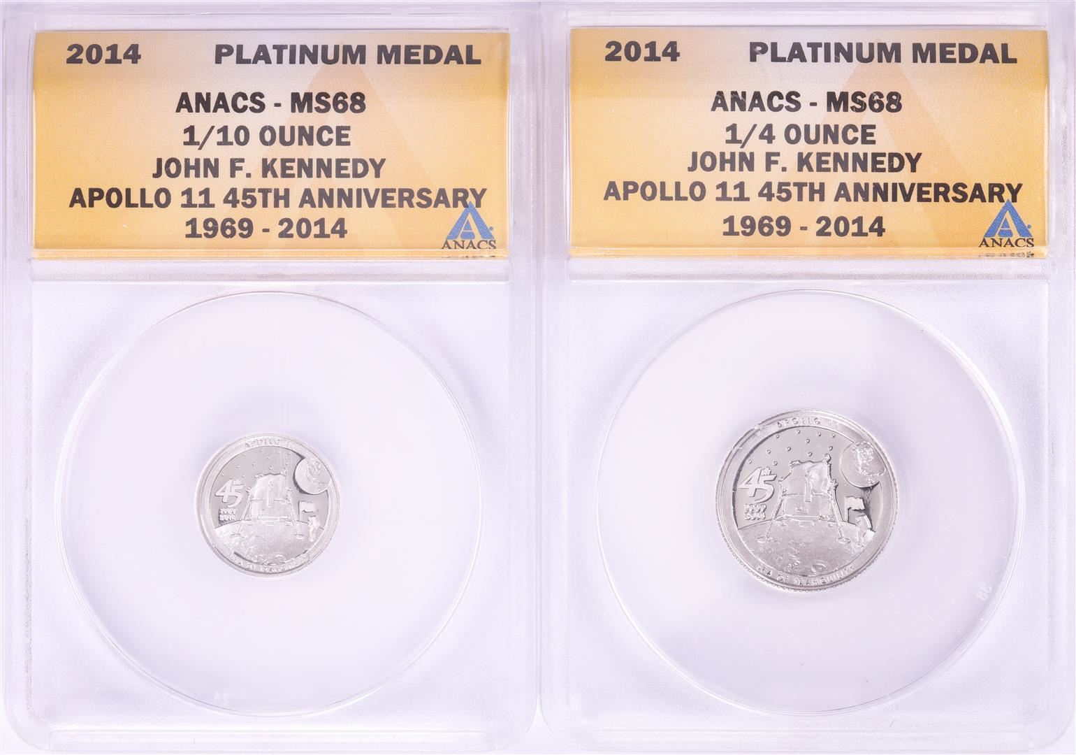 Set of 2014 Proof 1/10 & 1/4 oz Platinum JFK Apollo 11 Anniversary Medals ANACS MS68
