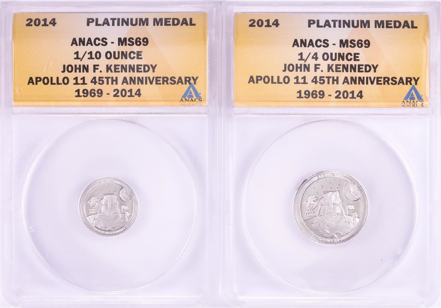 One Set of 2014 Proof 1/10 & 1/4 oz Platinum JFK Apollo 11 Anniversary Medals ANACS MS69. ANACS Certified.