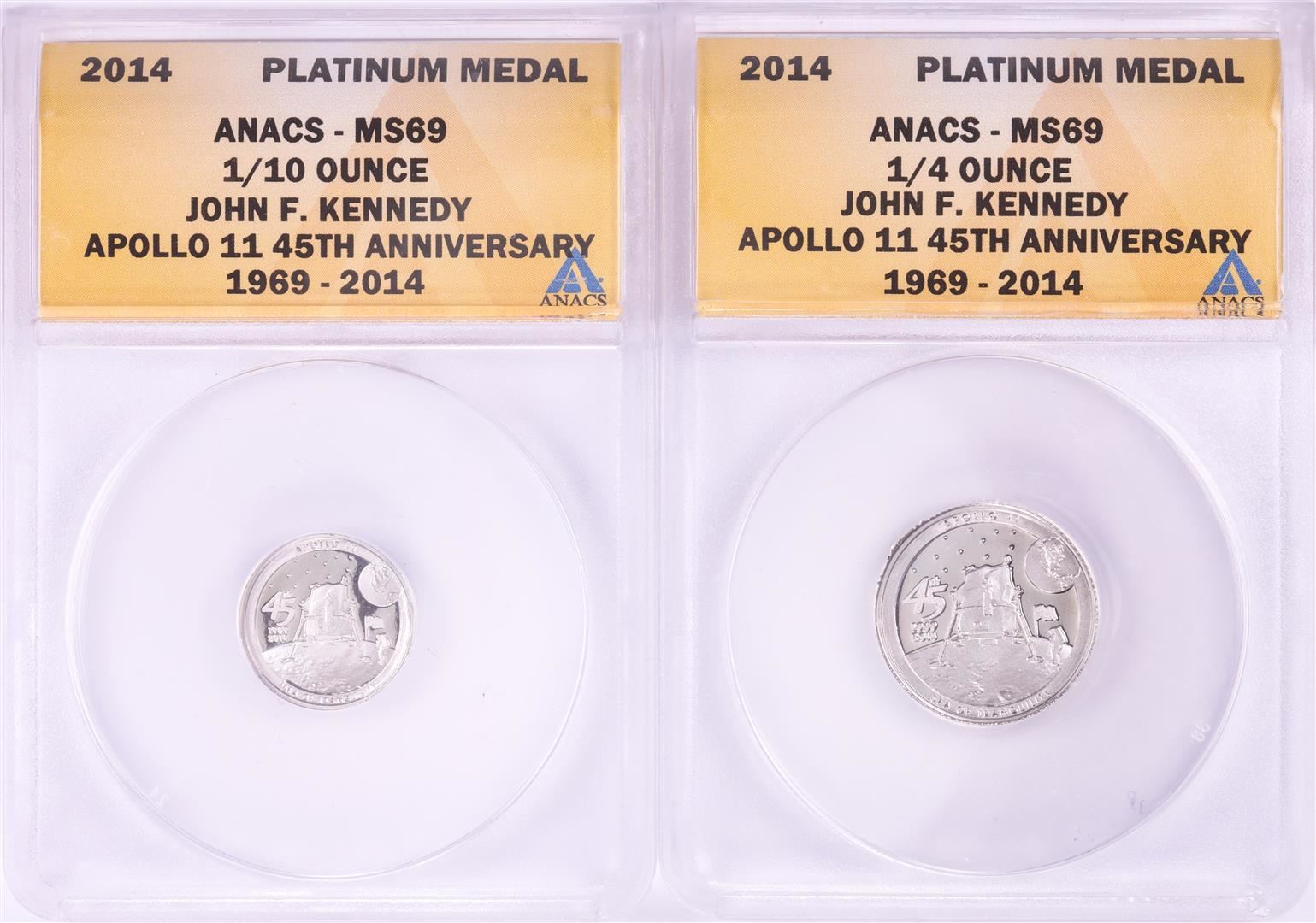 Set of 2014 Proof 1/10 & 1/4 oz Platinum JFK Apollo 11 Anniversary Medals ANACS MS69