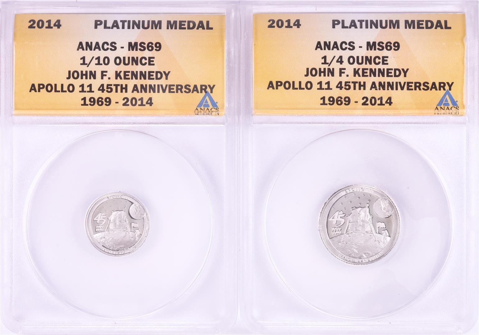 Set of 2014 Proof 1/10 & 1/4 oz Platinum JFK Apollo 11 Anniversary Medals ANACS MS69