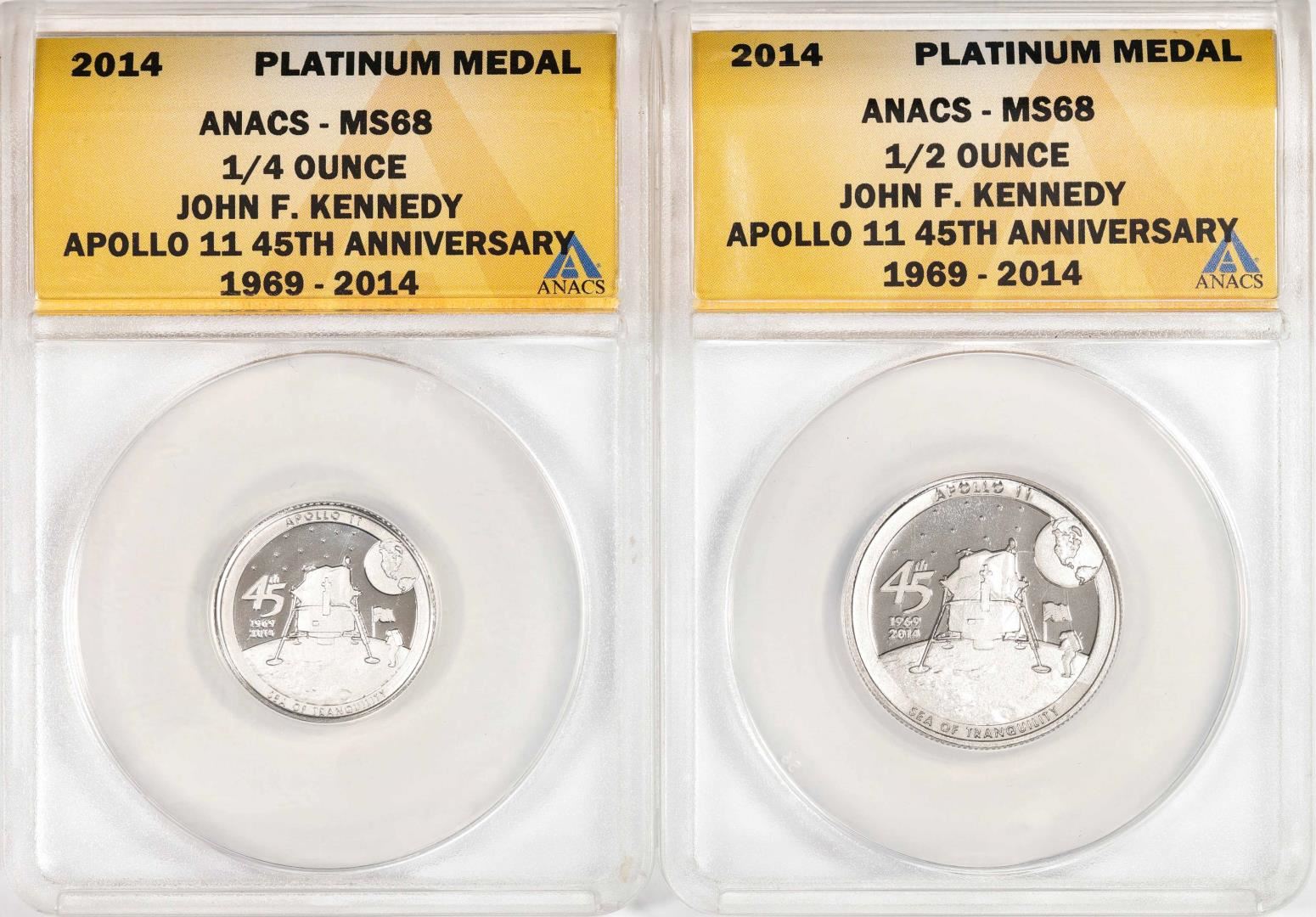 One Set of 2014 Proof 1/4 oz & 1/2 oz Platinum JFK Apollo 11 Anniversary Medal ANACS MS68. ANACS Certified.