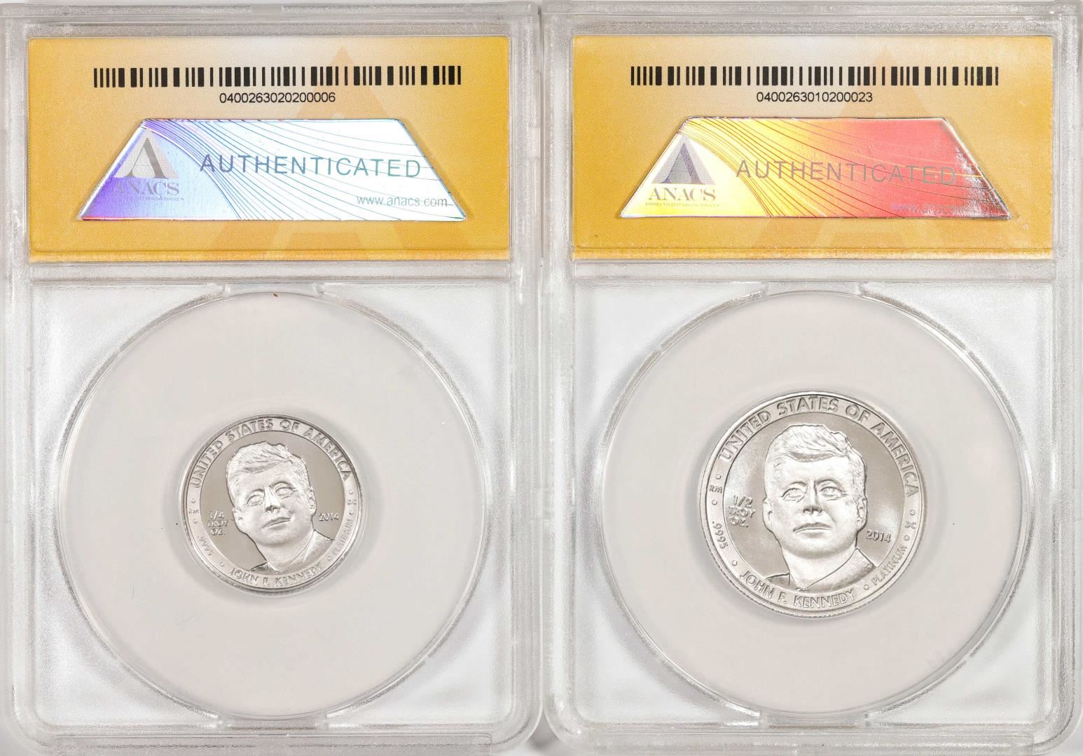 One Set of 2014 Proof 1/4 oz & 1/2 oz Platinum JFK Apollo 11 Anniversary Medal ANACS MS69. ANACS Certified.