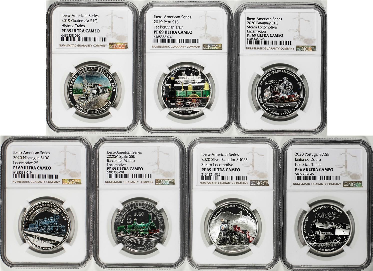 One Set of 2019-2020 Ibero-American Historic Train (7) Silver Coins NGC PF69 Ultra Cameo. NGC Certified.