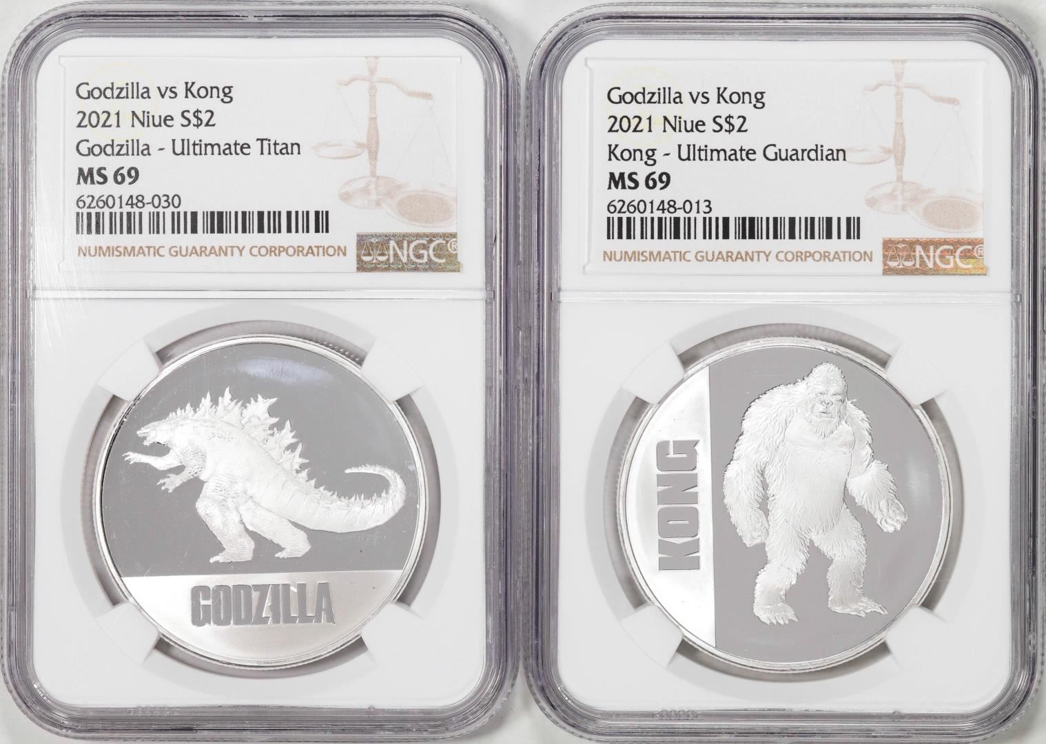 One Set of 2021 Niue $2 Godzilla vs Kong Silver Coins NGC MS69. NGC Certified.