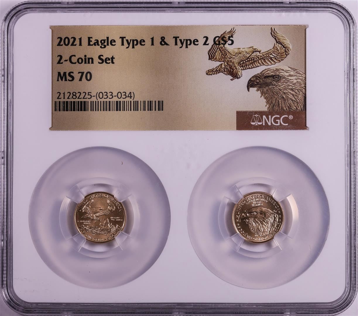 Set of 2021 Type 1 & Type 2 $5 American Gold Eagle Coins NGC MS70